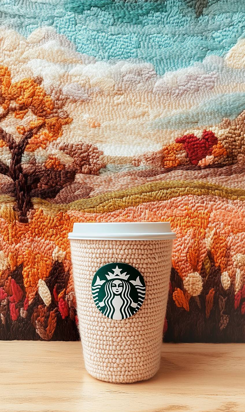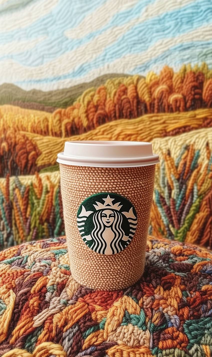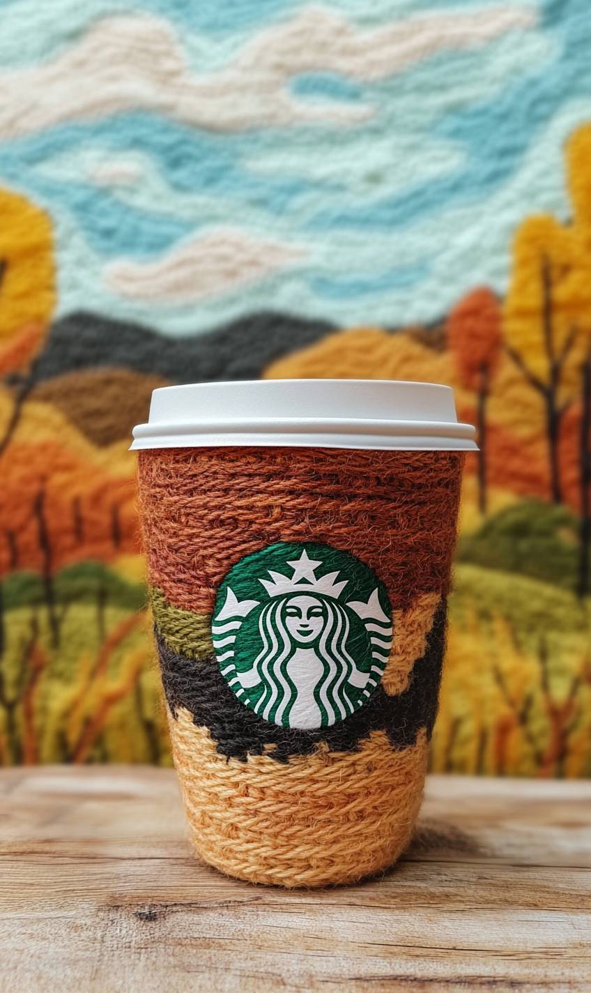 A woven yarn Starbucks coffee cup sits on a table against a hand-woven landscape of grass, trees, and sky. The woven details look like they were made of yarn or wool, giving the scene an artistic feel. In autumn, the warm colors are bright and uniform, the picture is simple and modern art style, lovely, magical, super detailed, high resolution.