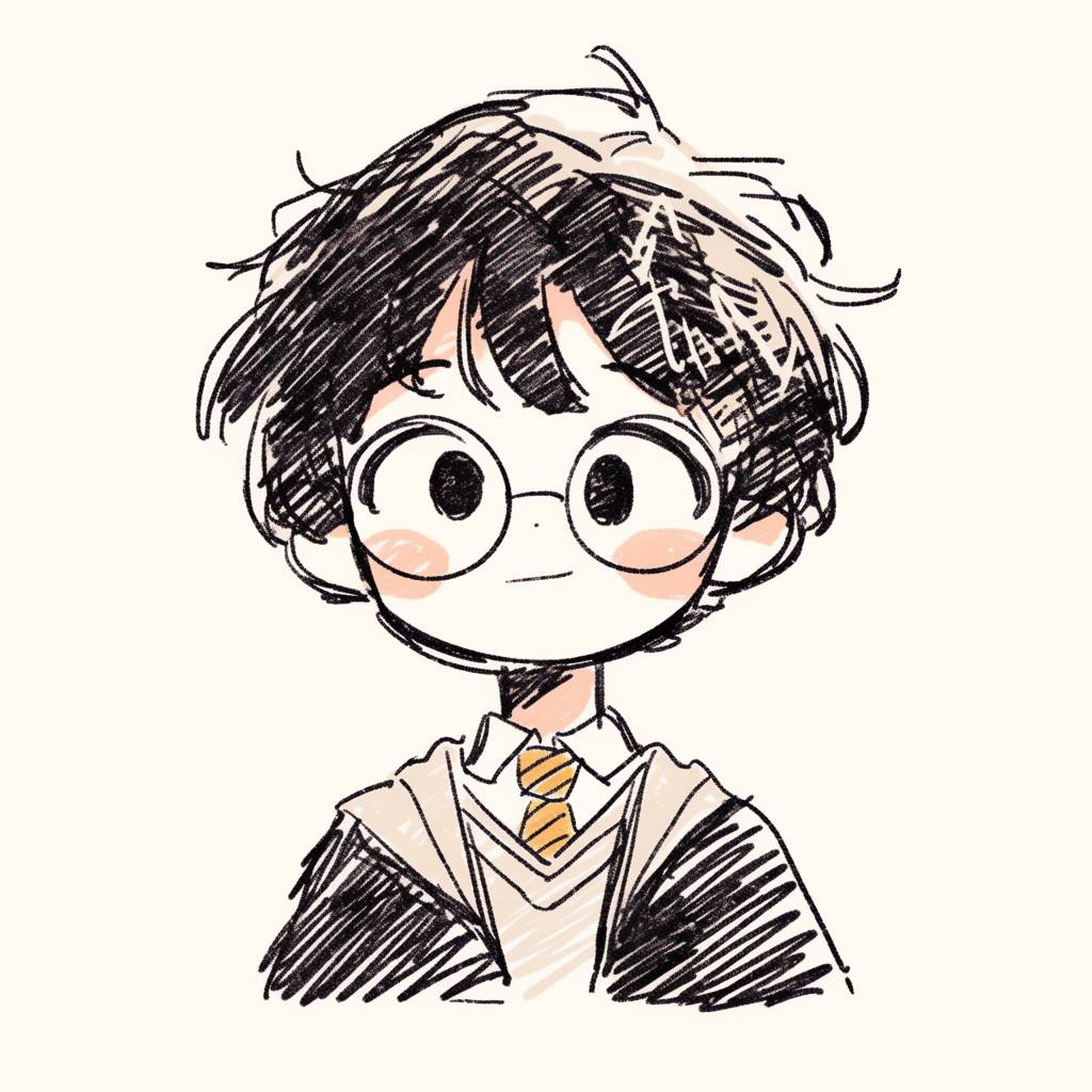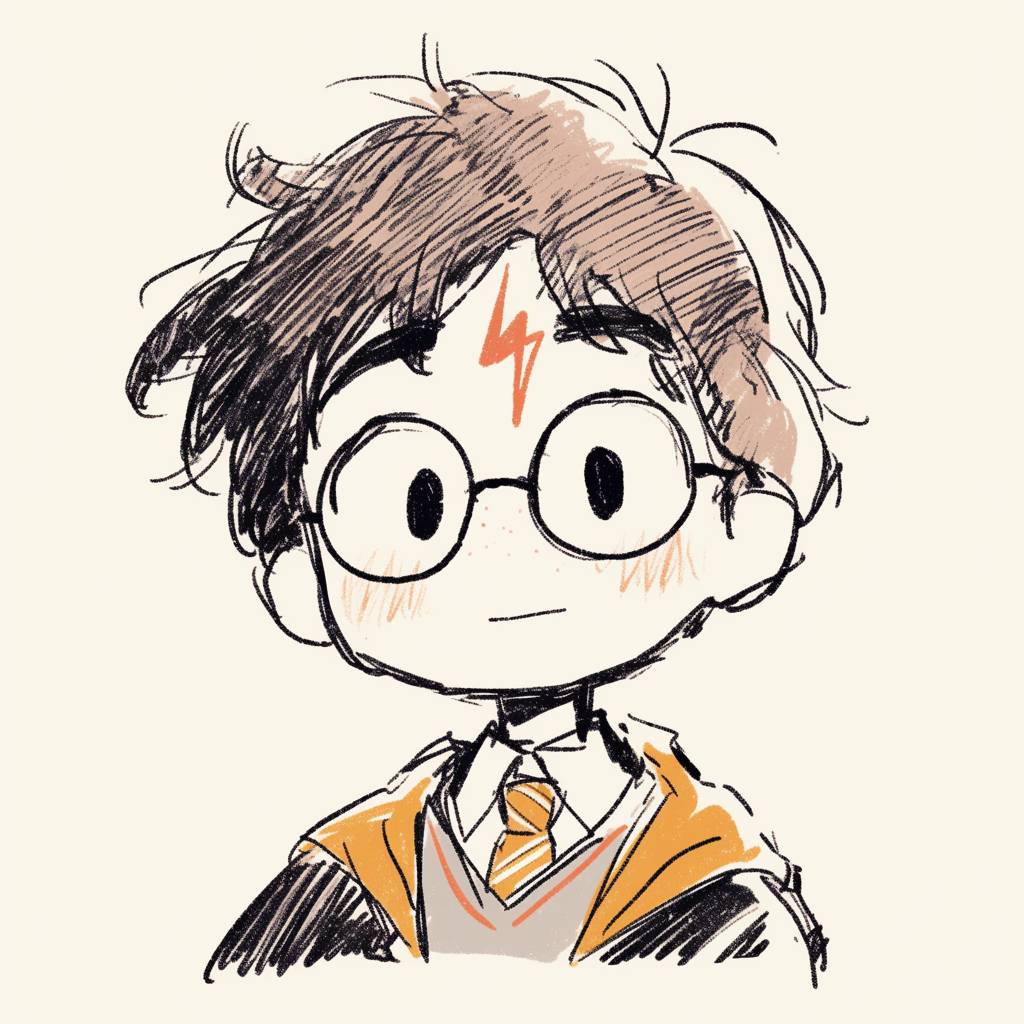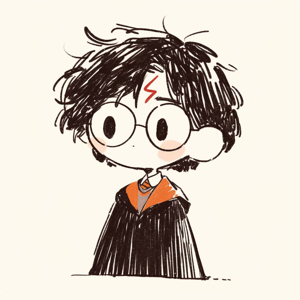 Harry Potter, wearing round glasses with a lightning bolt on his forehead, Harry Potter IP,chibi,with brown eyes,sharpie illustration, bold lines and solid colors, simple details, minimalist --ar 1:1 --sref 4059834270 --stylize 200 --niji 6