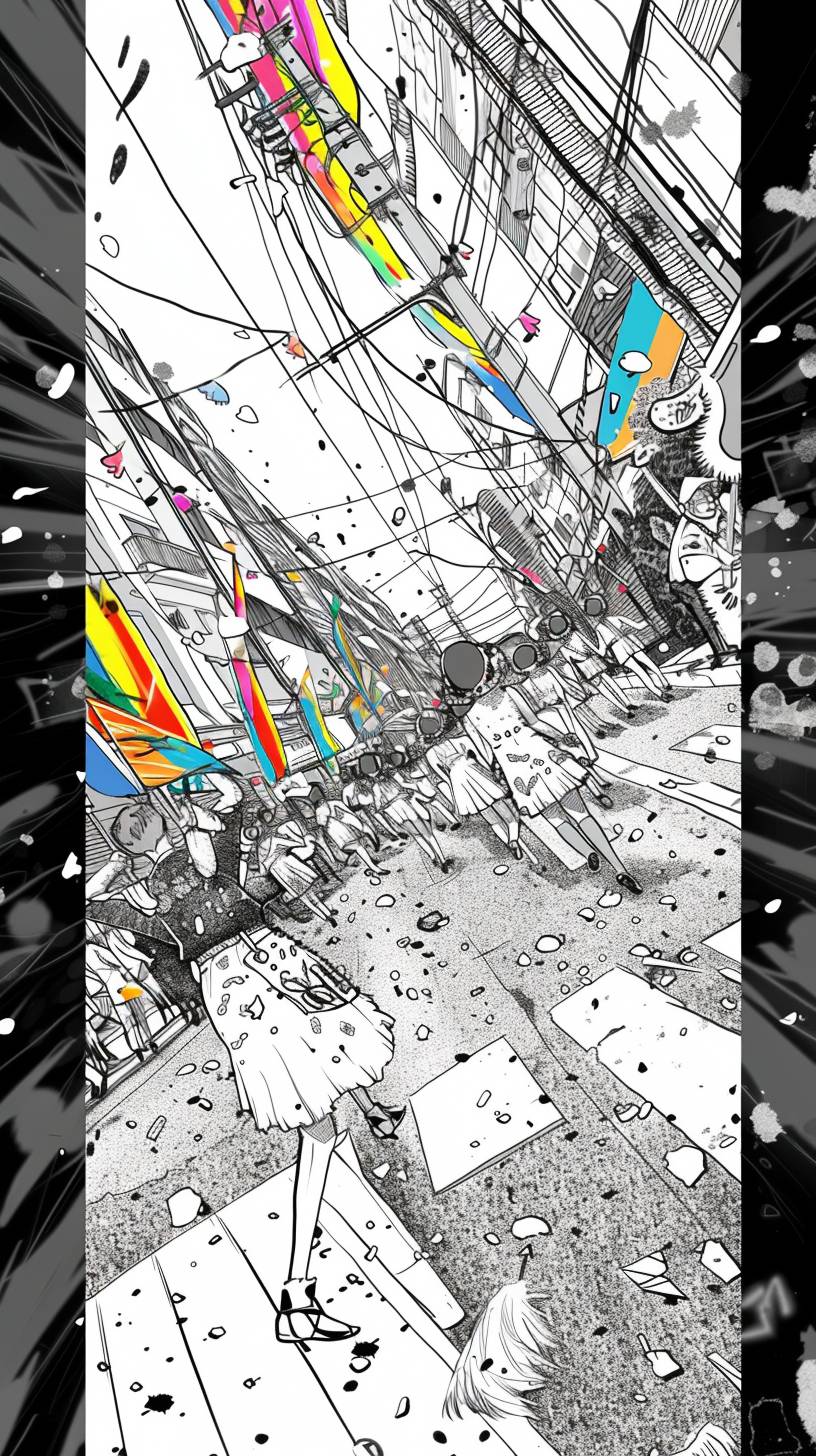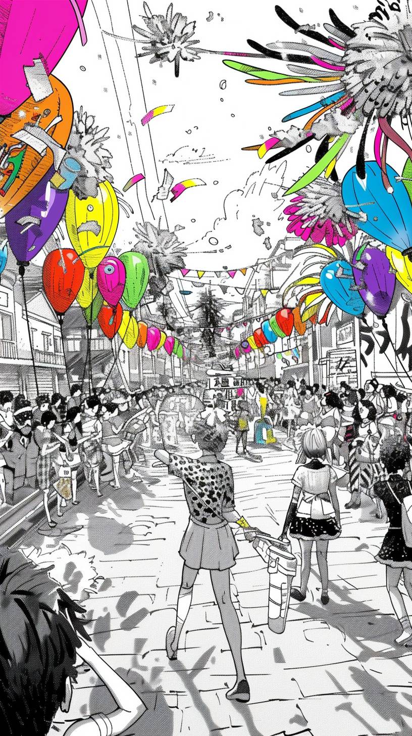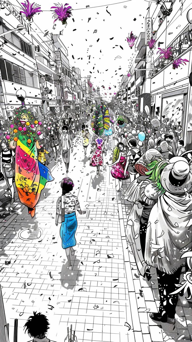 A colorful street parade, with people in elaborate costumes and floats adorned with glitter and feathers. Dancing and music fill the air. In the style of a vibrant illustration. --sref 2702968768 --ar 9:16 --v 6.0