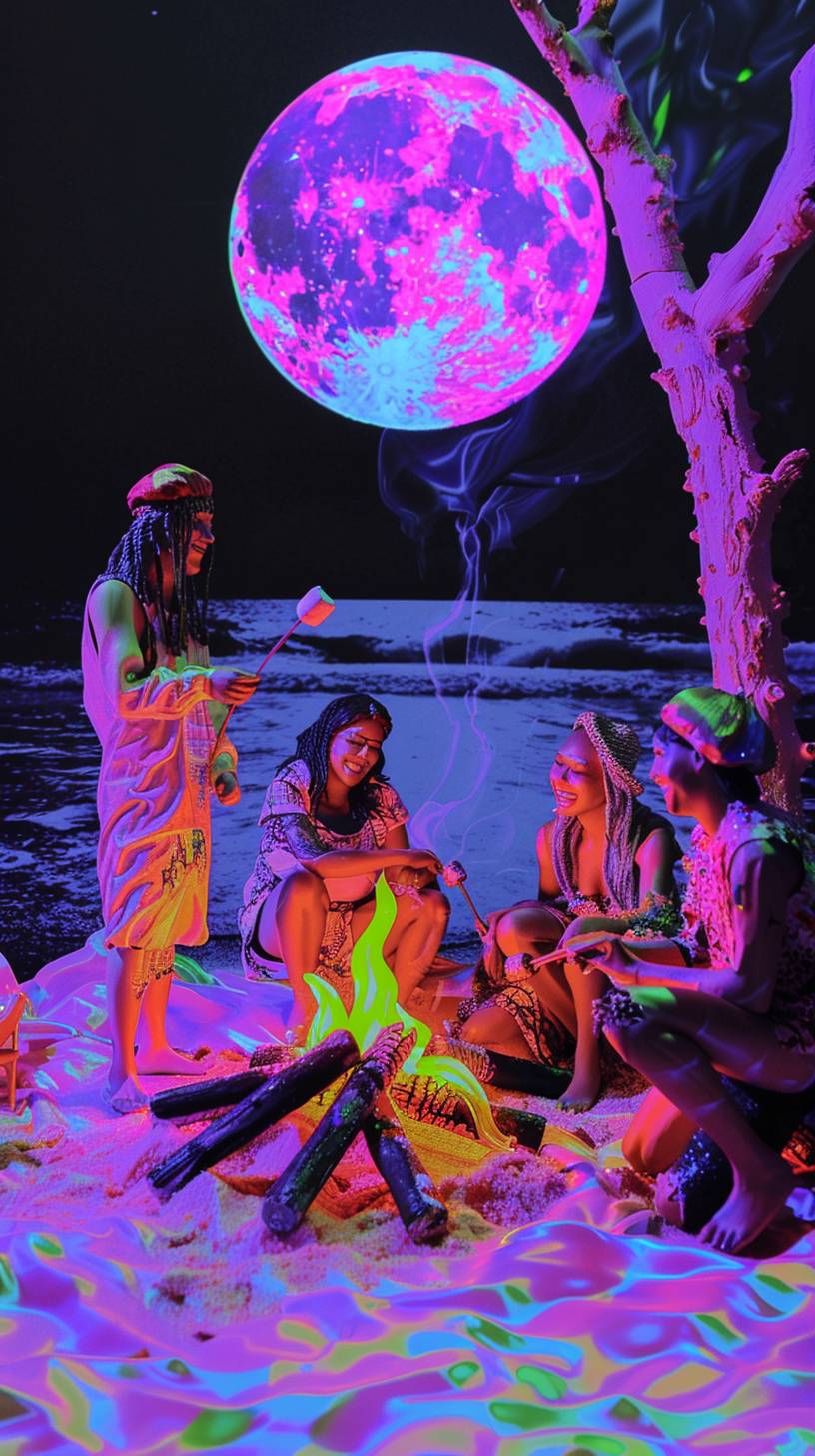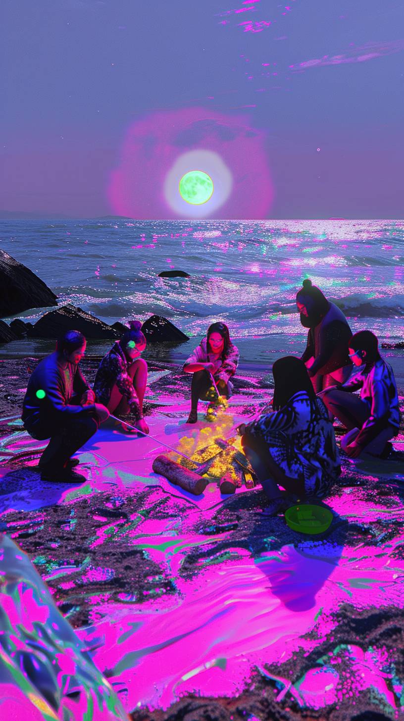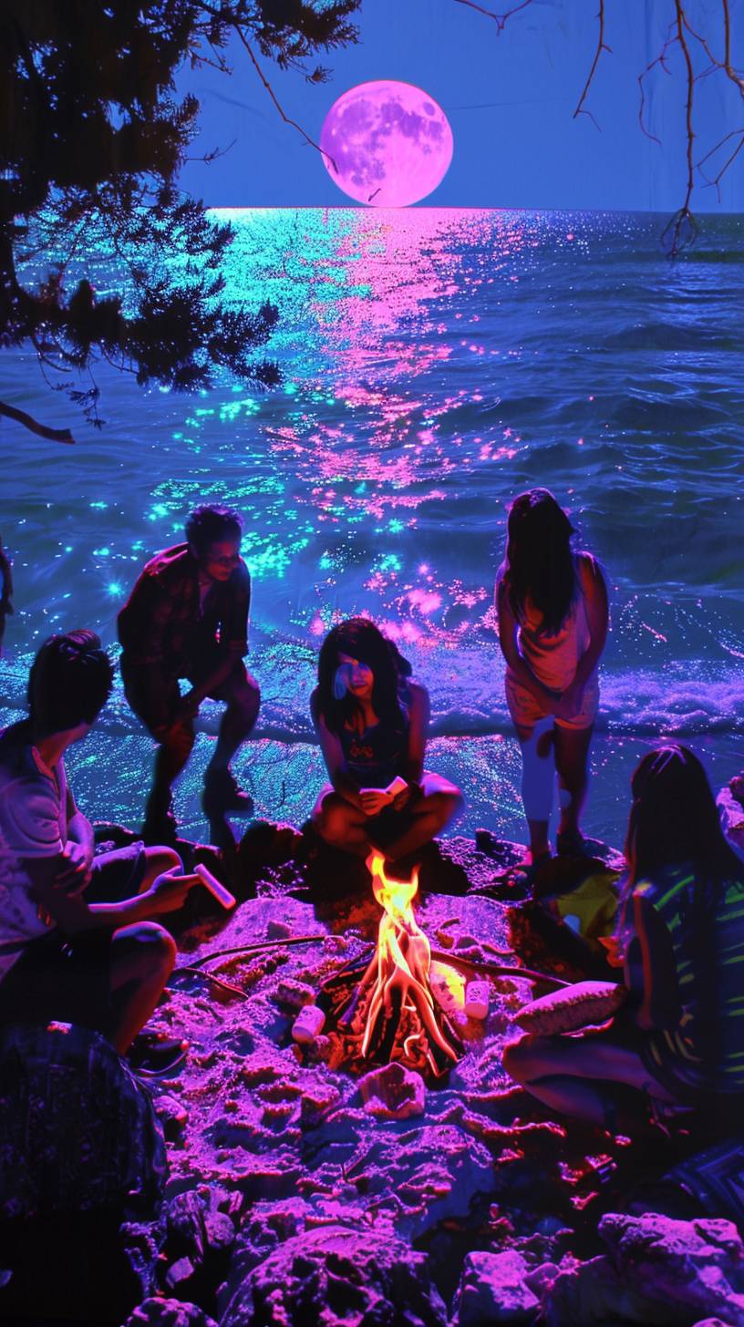 A group of friends gathered around a bonfire on a moonlit beach. They are roasting marshmallows and laughing. In the style of a vintage photograph. --sref 121921627 --ar 9:16 --v 6.0