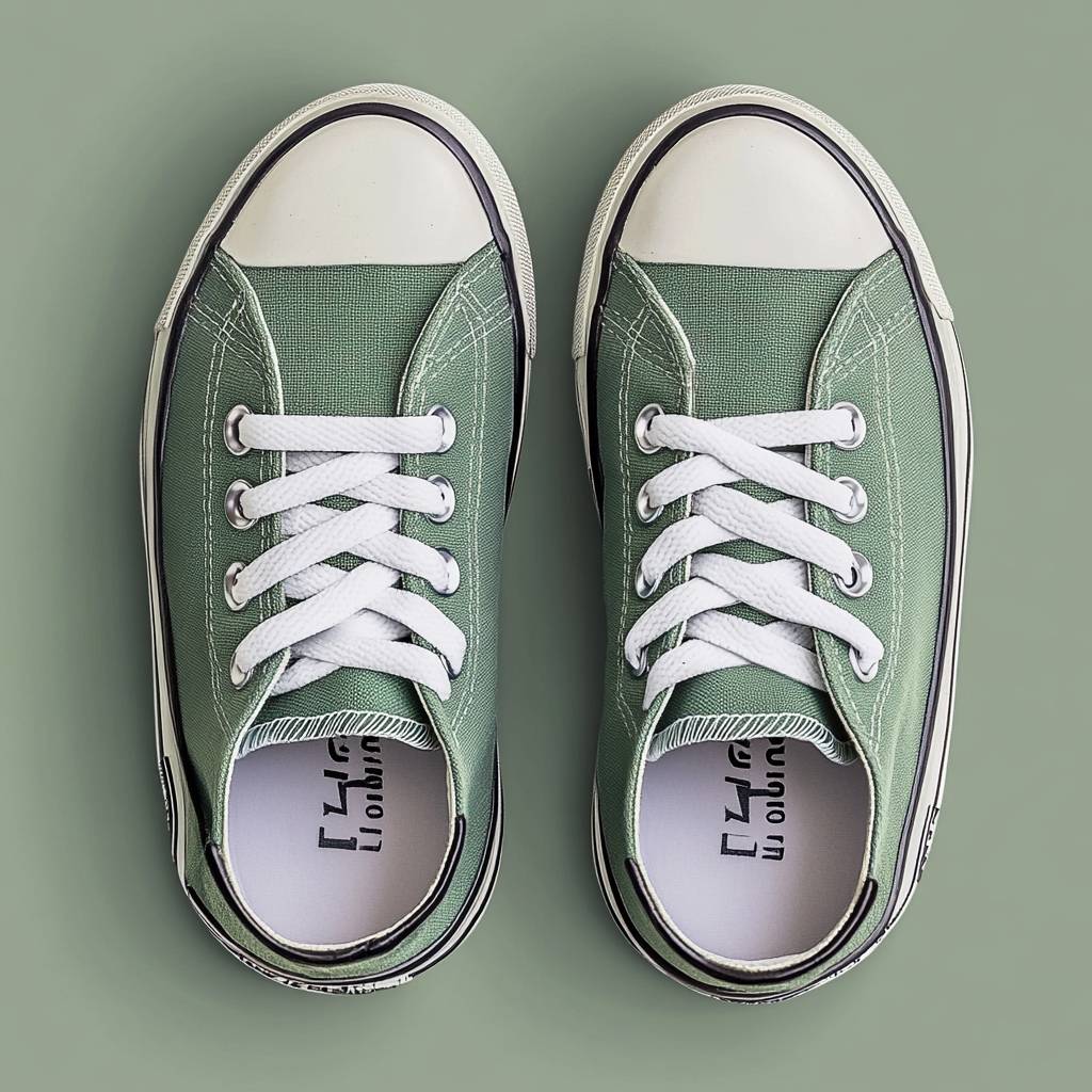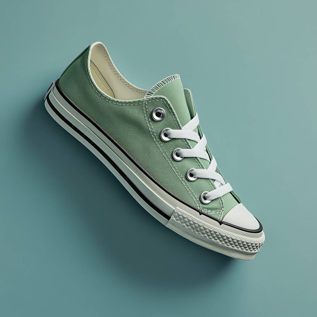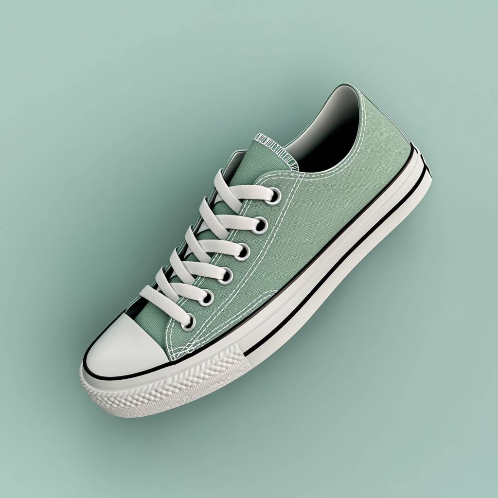 a bird's eye view of a Sage green and white low-top Converse, on a flat background, product photography. ultra detailed --stylize 50 --v 6.1