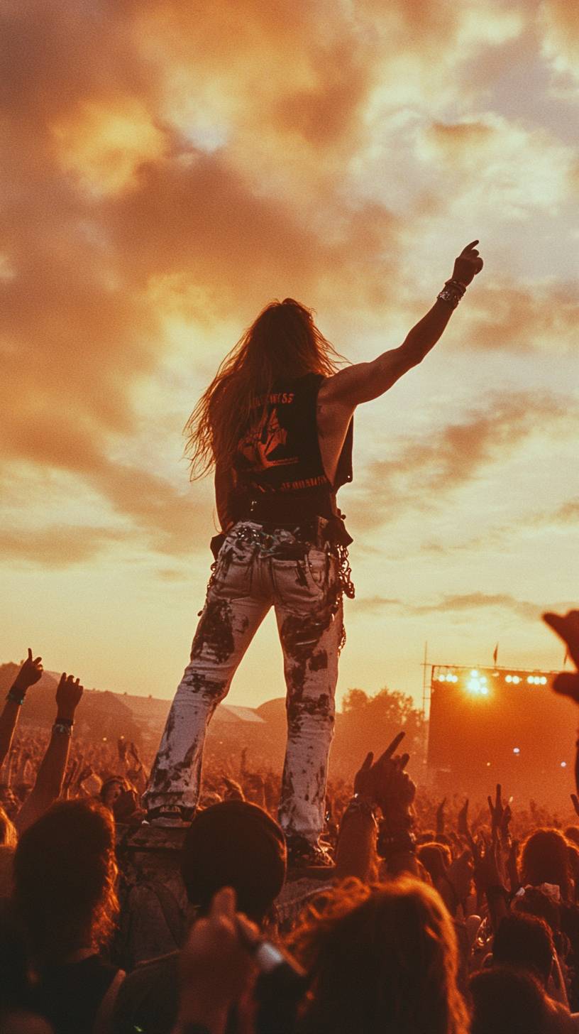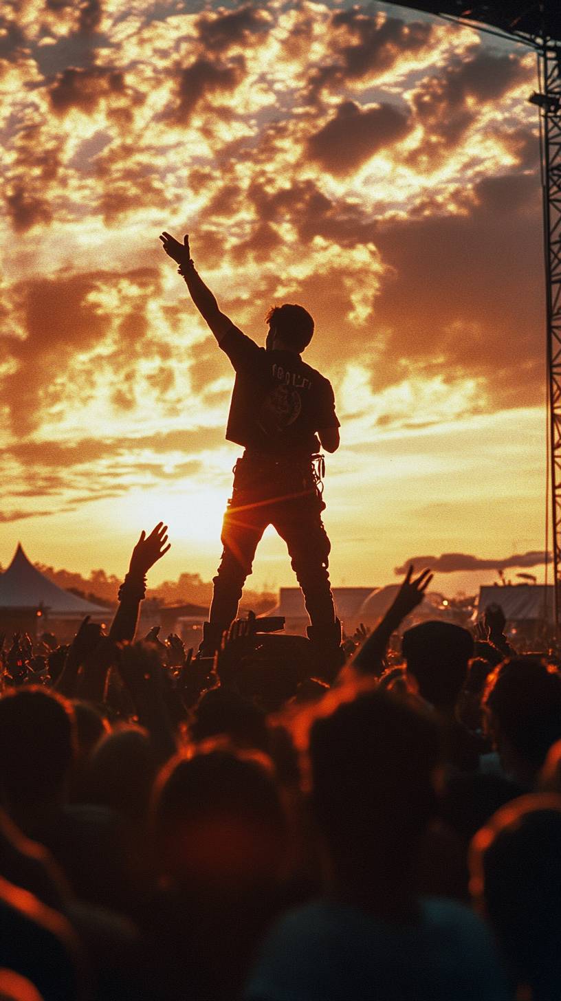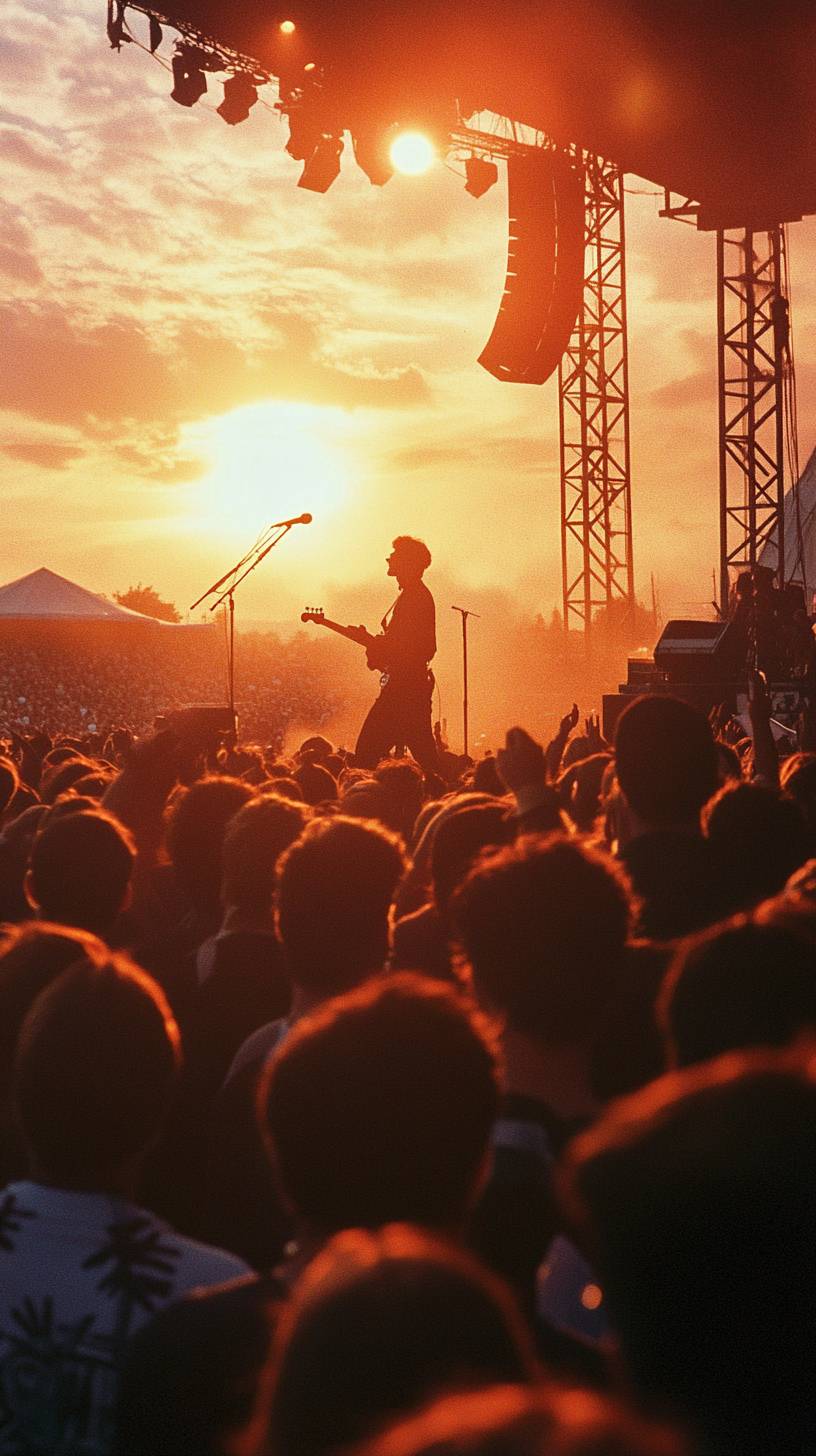 rockfestival 1990’s artist on the festival podium stage is greeting the public on a day with sunset in Summer. kodak shot --ar 9:16 --v 6.1