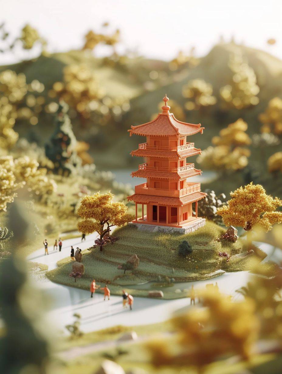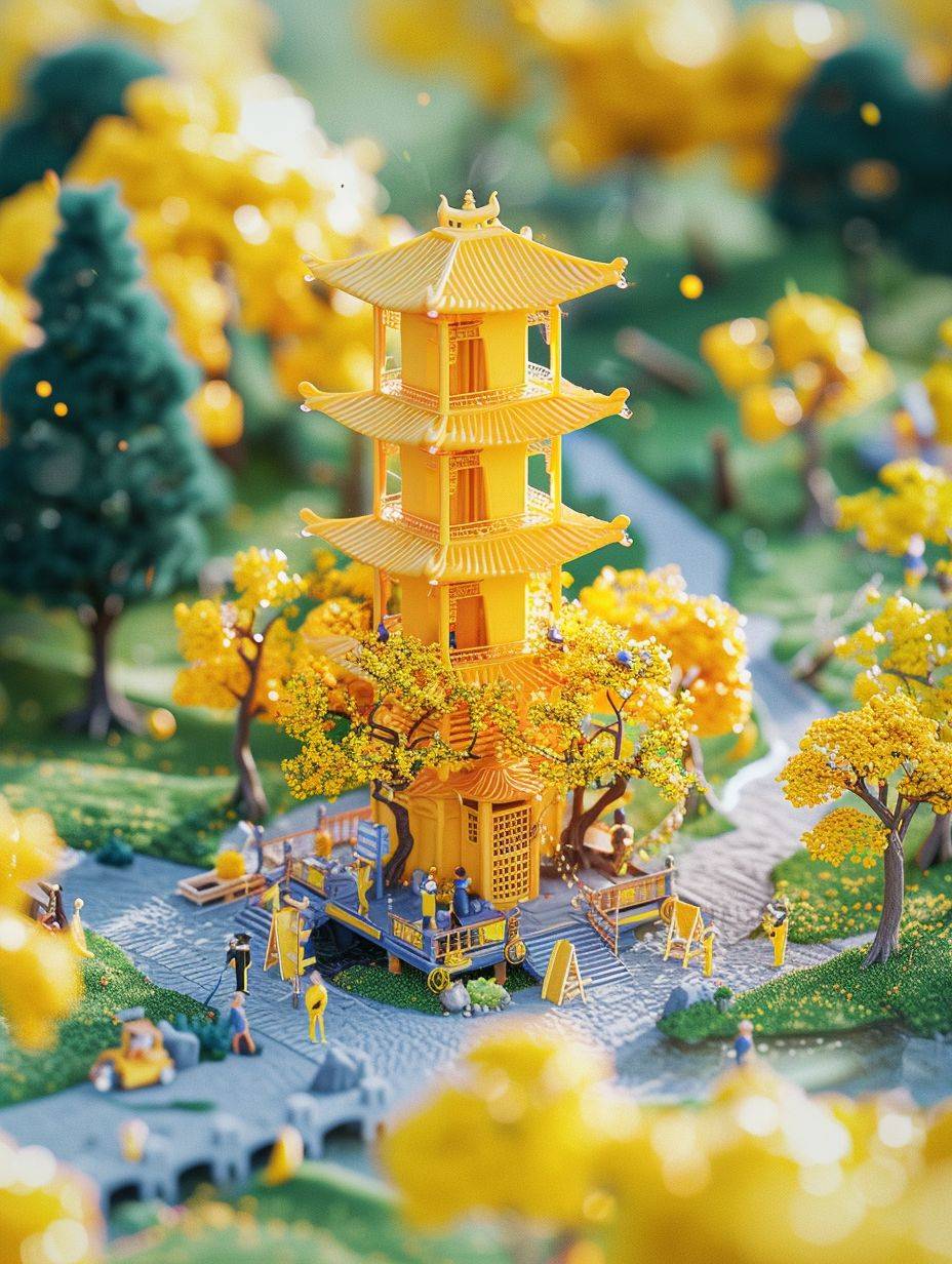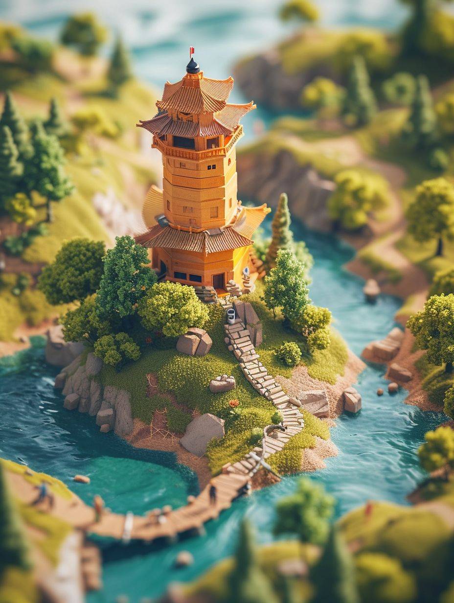 miniature, super cute clay world, isometric view of Yellow Crane Tower ,cute clay freeze frame animation,The Water Cube, people, trees, grass, tilt shift,excellent lighting, volume, landscape, brush,rendering, 3D,super detail --ar 3:4 --v 6