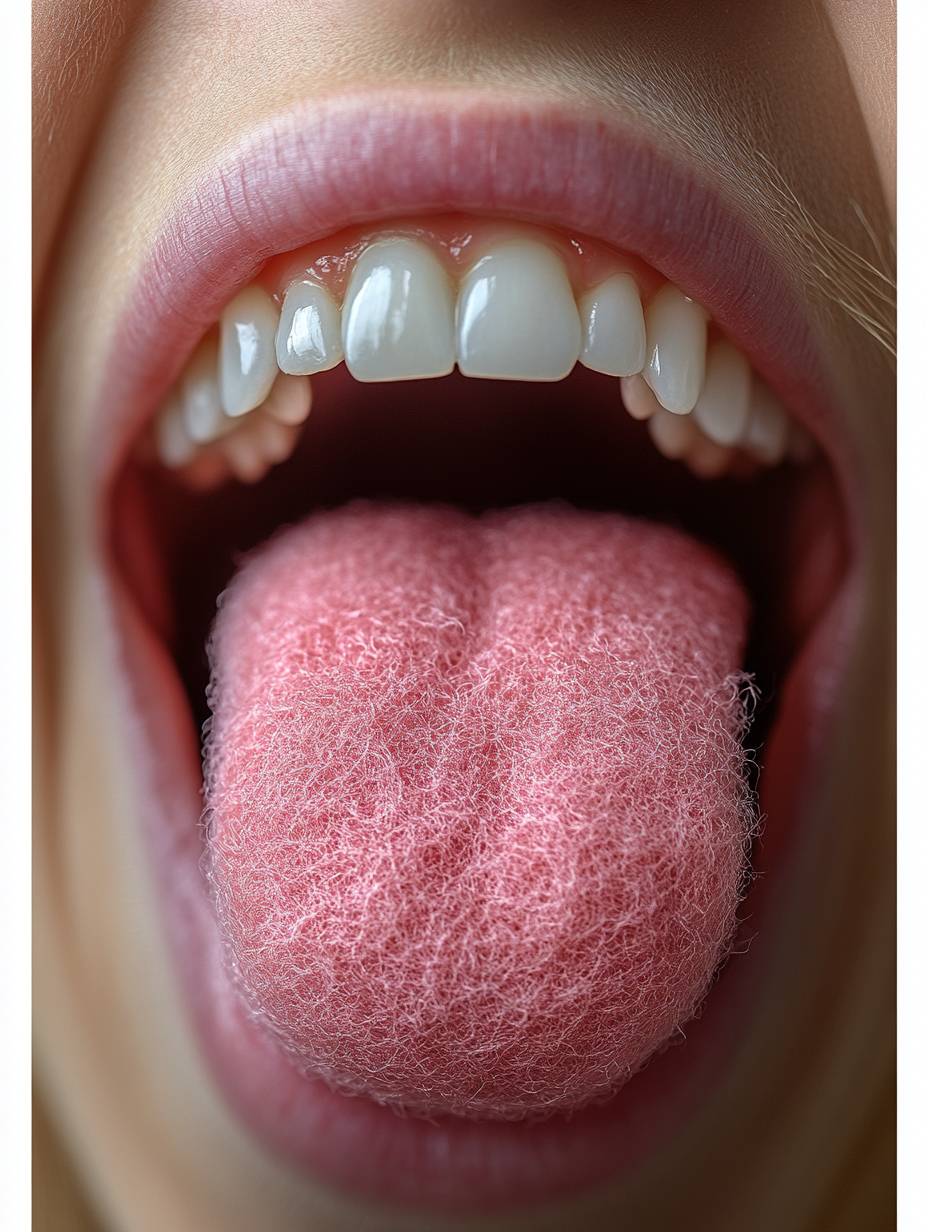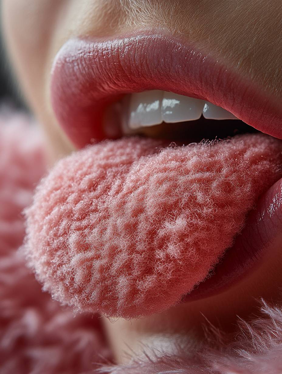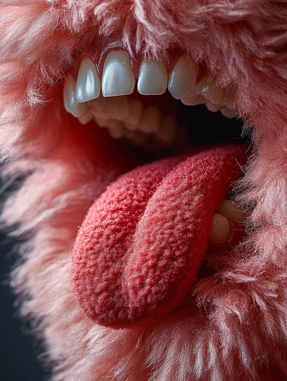 Close-up of a tongue with a pink felt-like edge, a person's mouth open and sticking out to show the red textured circle on their white teeth. The focus is sharp against a soft background, capturing the detailed texture of the wool fabric. Bright light illuminates the vibrant color of the tongue, highlighting its unique shape. High-resolution photography captures every detail for crisp clarity. --ar 3:4 --stylize 750 --v 6.1