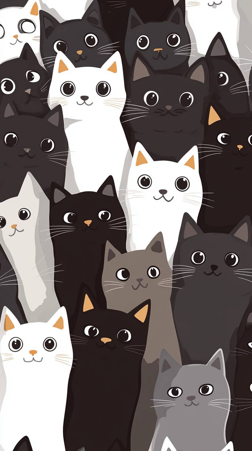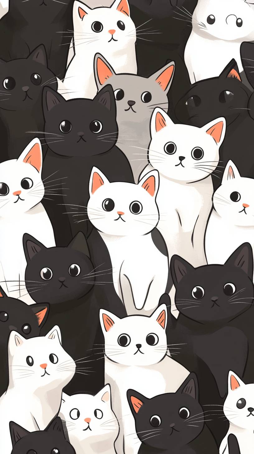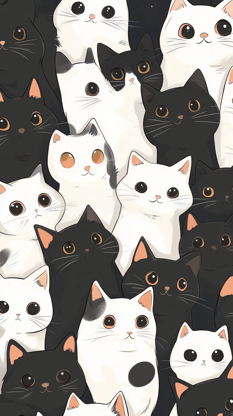 A large group of cute cats, all white and black, all with round eyes, are seen from above in an anime-style illustration. The background has a simple color scheme, creating a playful atmosphere. This design adds charm to the cat theme, making it suitable for various applications such as posters or print-on-demand products. The image appears to be focus-stacked, with focus lines, and has a flat, vector art style reminiscent of Disney animation. --ar 9:16 --v 6.1