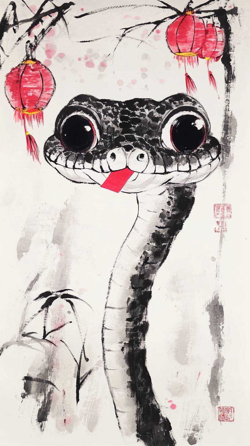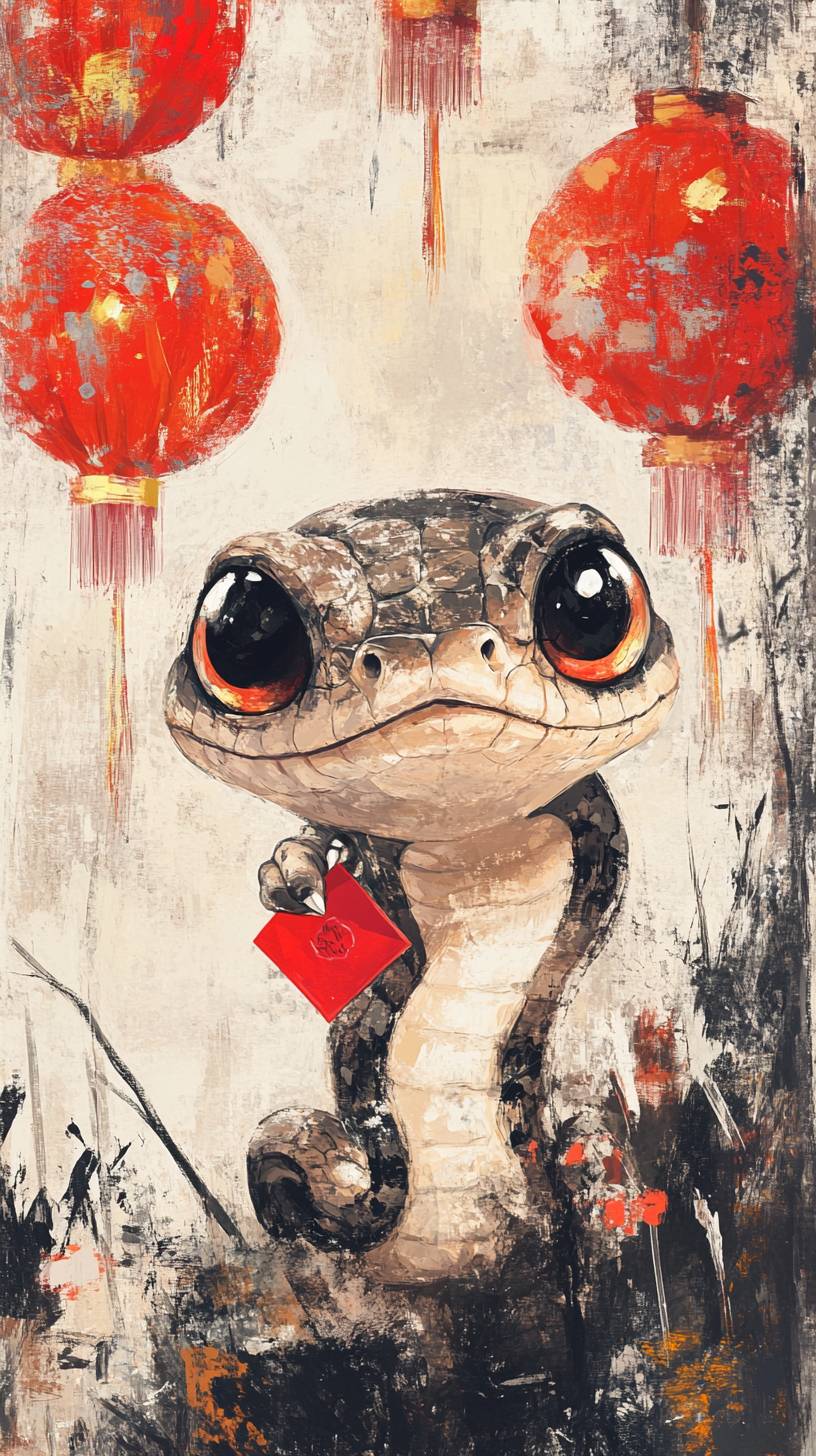 A super cute snake with big eyes, in a festive Chinese New Year atmosphere, with red lanterns and holding a red envelope, the art style is a bit of cute Chinese ink wash. by Wu Guanzhong --ar 51:91 --v 6.1
