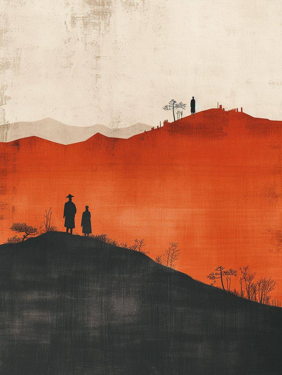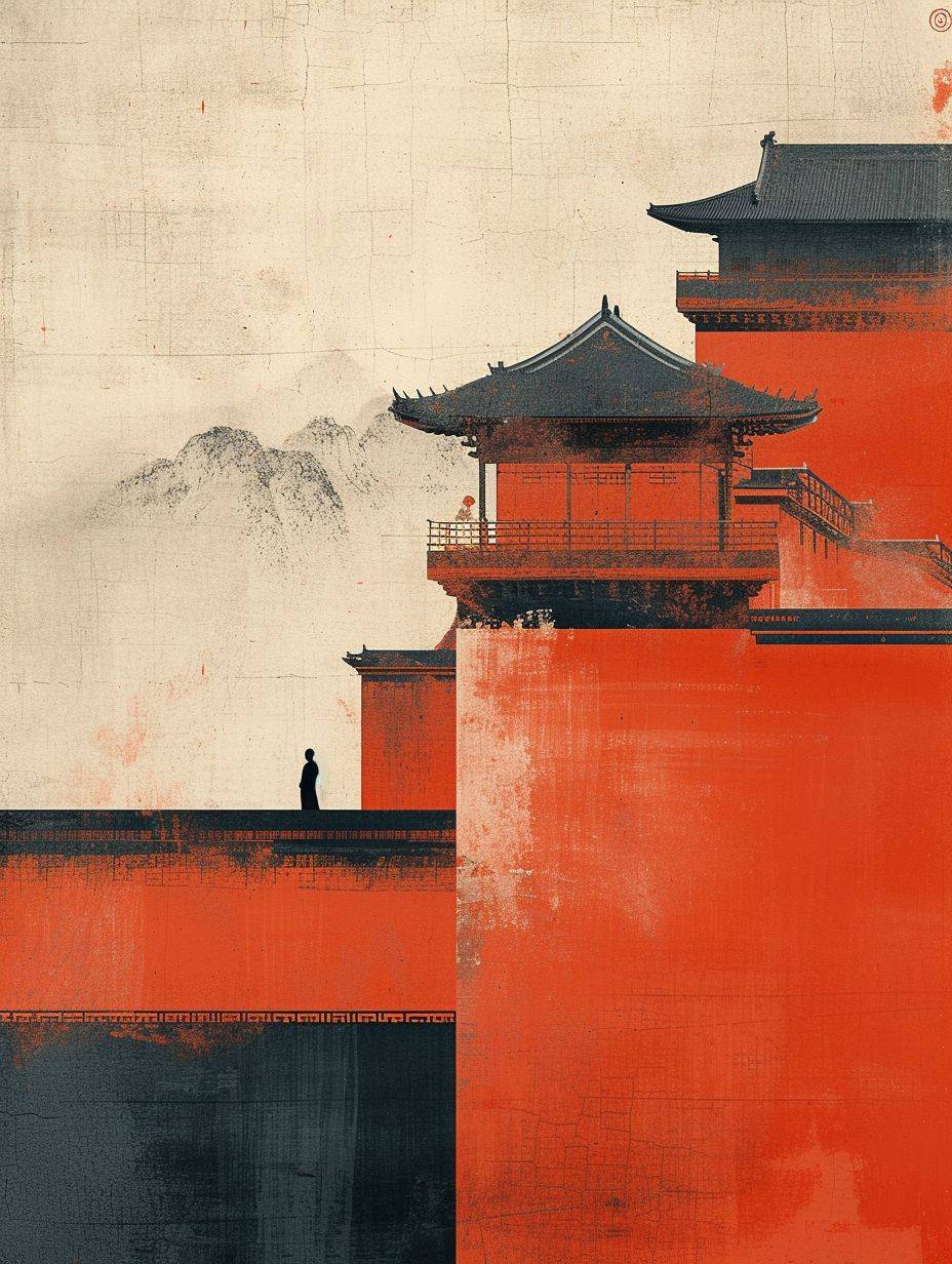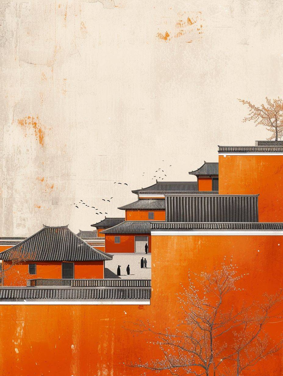 Minimalist Song dynasty mural by Alessandro Gottardo, Heian period, Zen, dark orange and light beige style, enigmatic figures, elegant cityscape, historical painting, super fine detail --ar 3:4 --v 6 --stylize 250