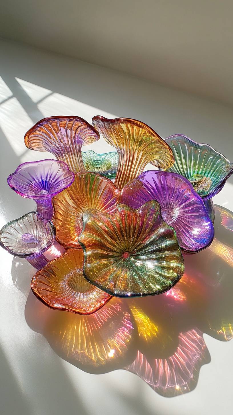 a translucent of glass mushrooms is displayed on a white floor. Each the vegetables features a shiny, beautiful glass work, made of crystal, soft glow , curved surface. The soft lighting creates gentle reflections and shadows on the plate, enhancing the vegetables' vibrant color. vegetables illuminated by colorful reflections of light creating a spectrum of subtle rainbows across it, white clean picture --ar 9:16 --v 6.1