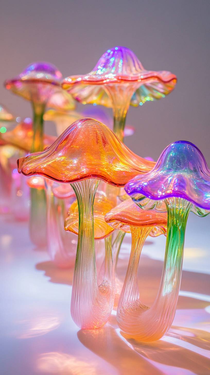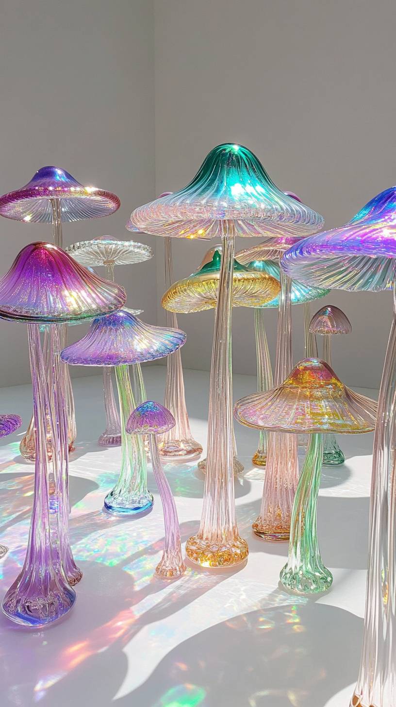 Translucent glass mushrooms are displayed on a white floor, with soft lighting enhancing their colors.
