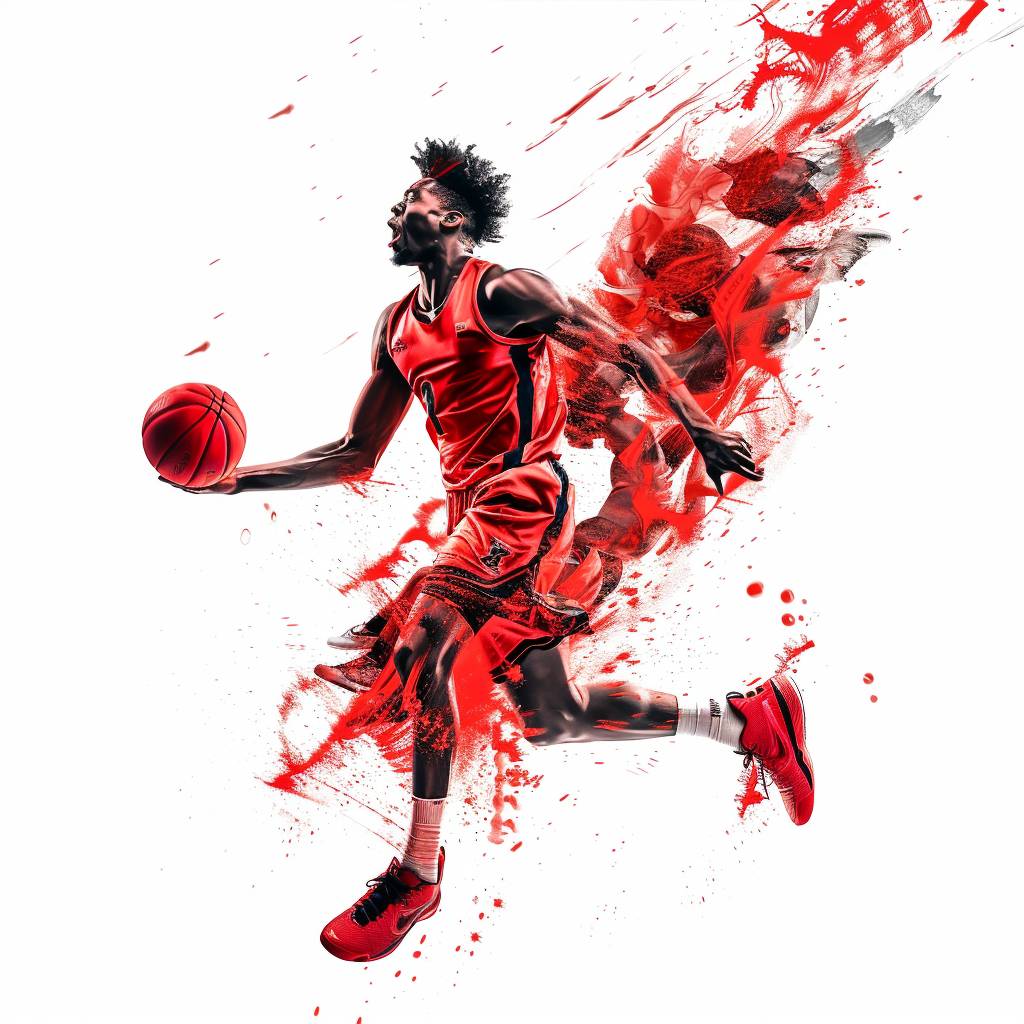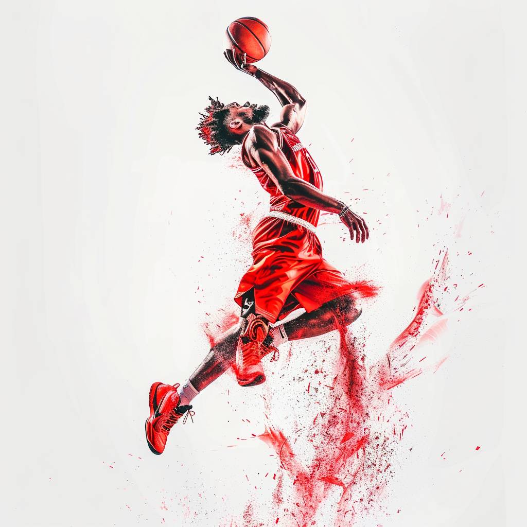 Sport photography of a professional basketball player in a red uniform dunking a ball, with a white background, and dynamic effects in the style of motion, photoshop effect, epic render. --v 6.0