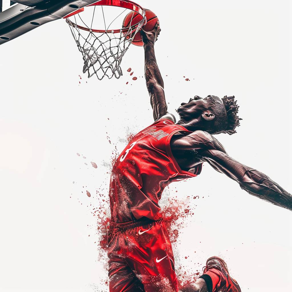 A professional basketball player in a red uniform dunks with a white background and dynamic motion effects.