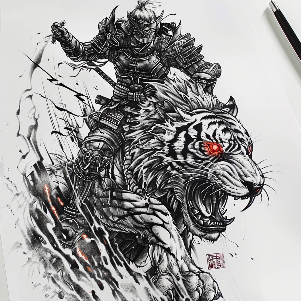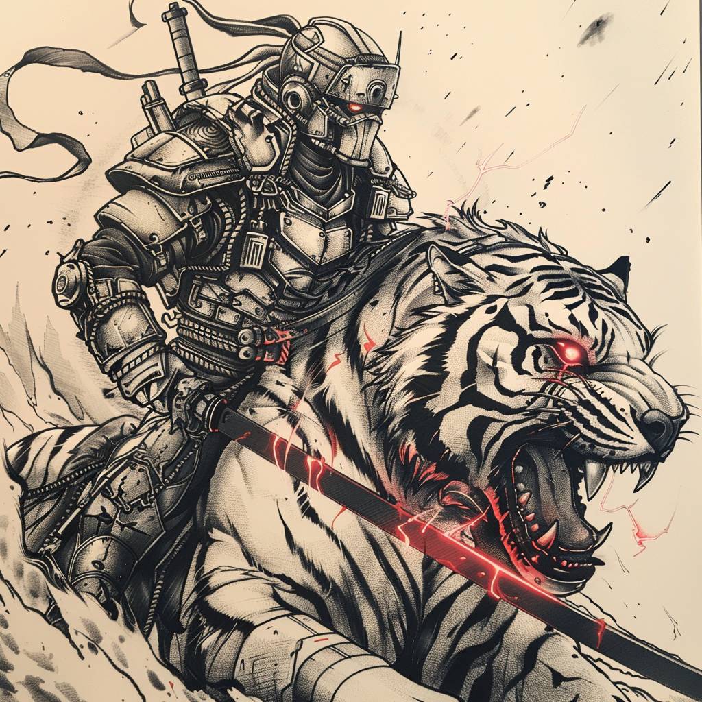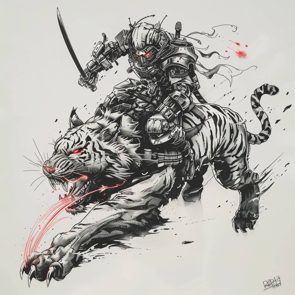Tattoo design, a cybernetic ninja in high-tech armor riding on a robotic tiger with glowing red eyes and metallic fangs, traditional cyberpunk tattoos, black ink on paper, high contrast, high details, no shadows, white background, detailed lines, fantasy artwork, white and grey, dark atmosphere, epic battle scene, war scene