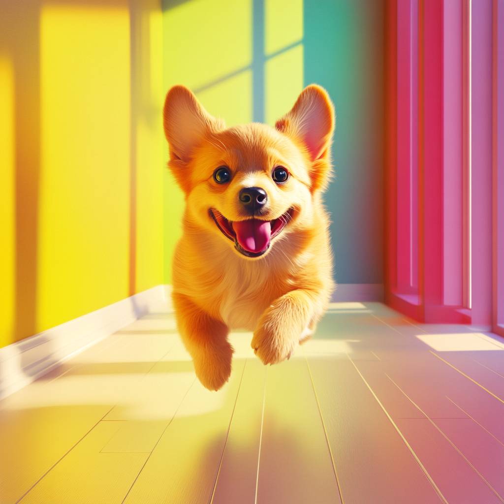 Hyper-realistic illustration. A happy puppy running through a room designed in bright colors. Bright colors and light.