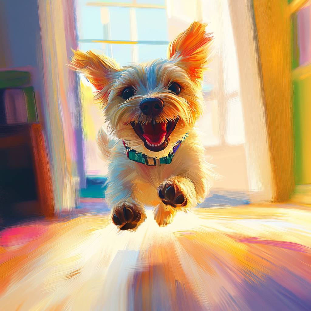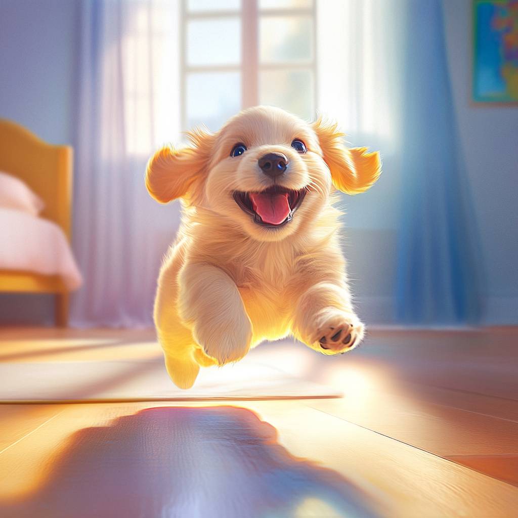 Hyper-realistic illustration. Happy puppy running through the room designed in bright colors. Bright colors and light --v 6.1