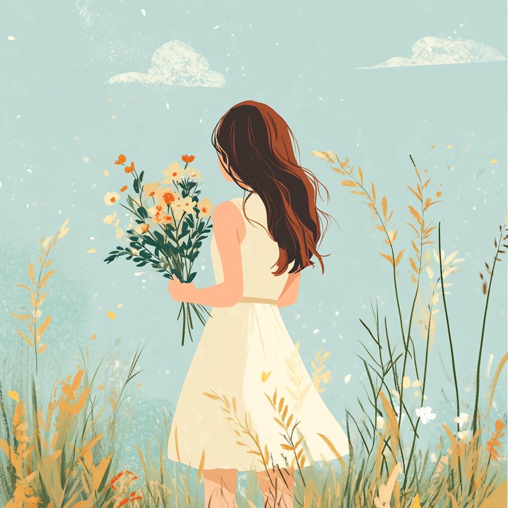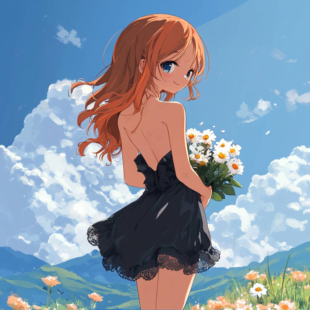 A cute girl in a black dress holding flowers stands in a field with a happy smile.