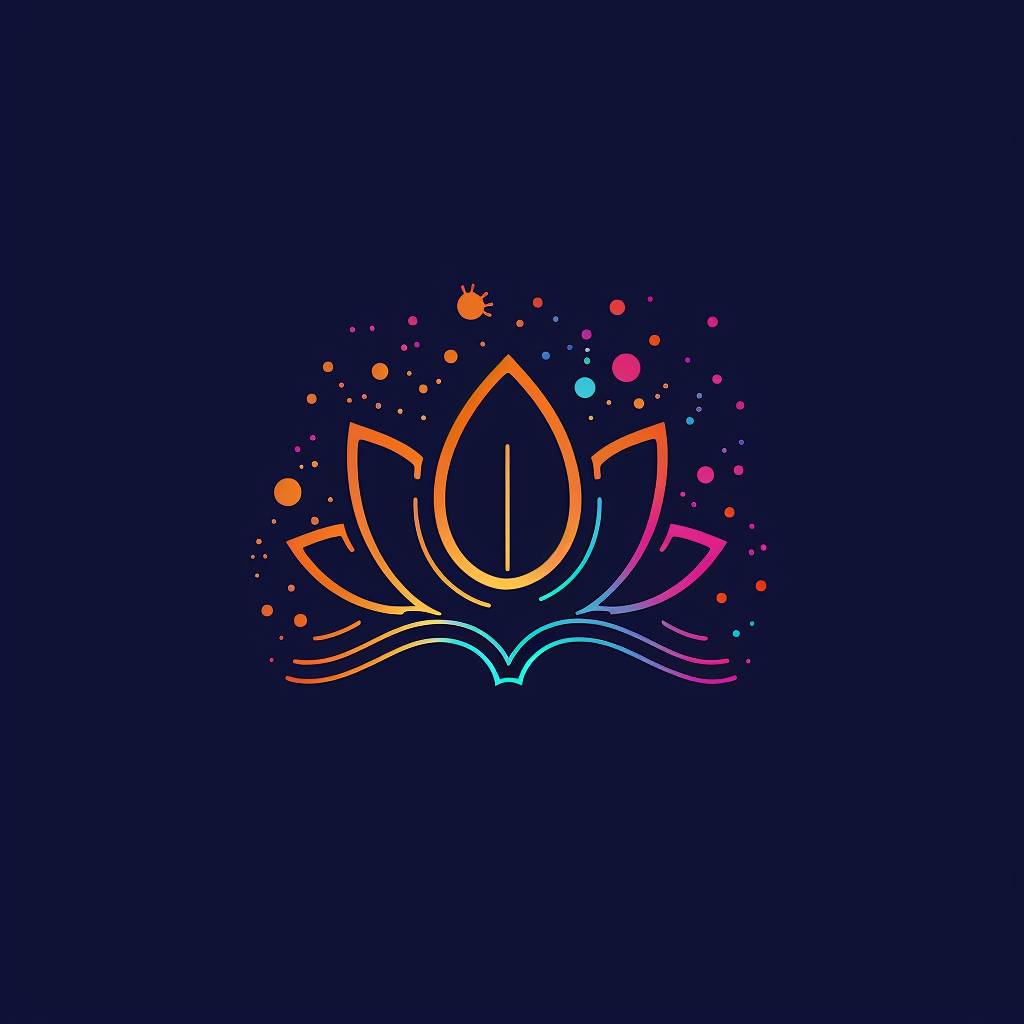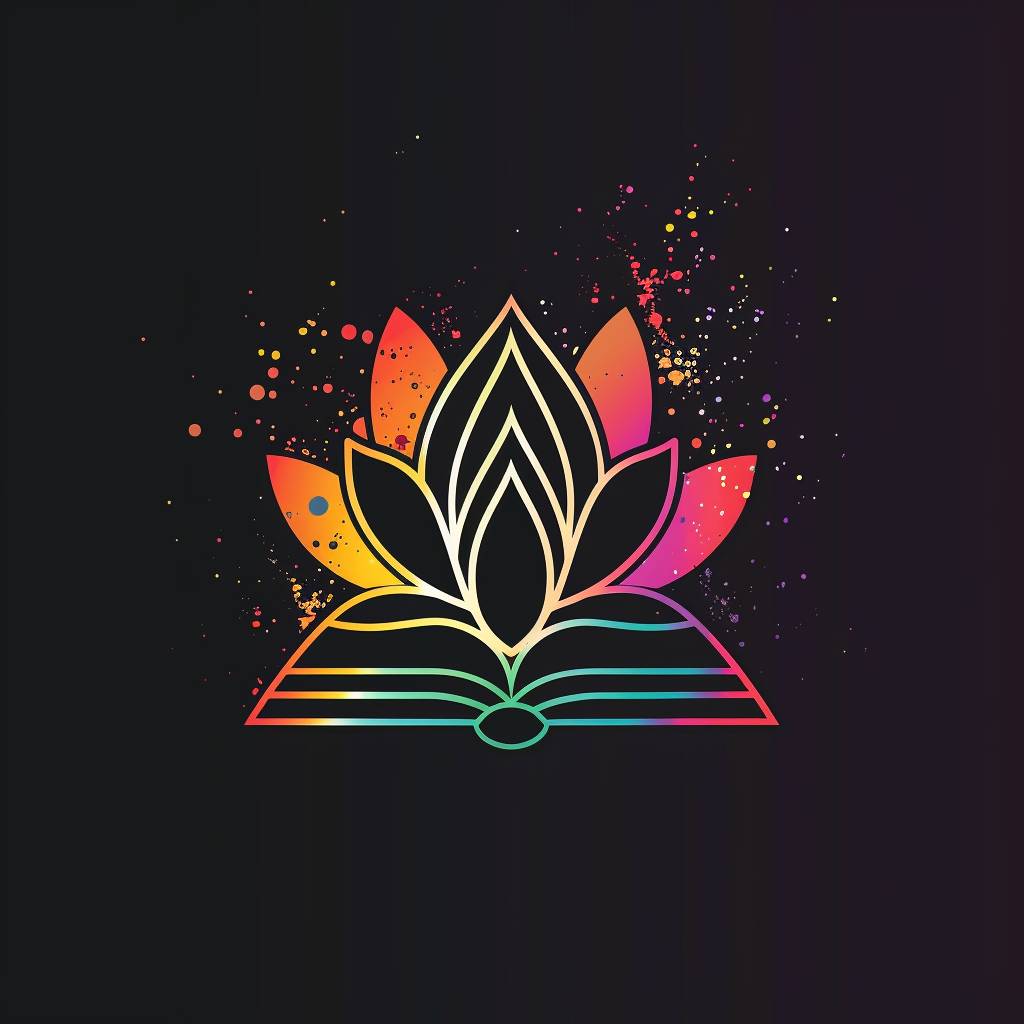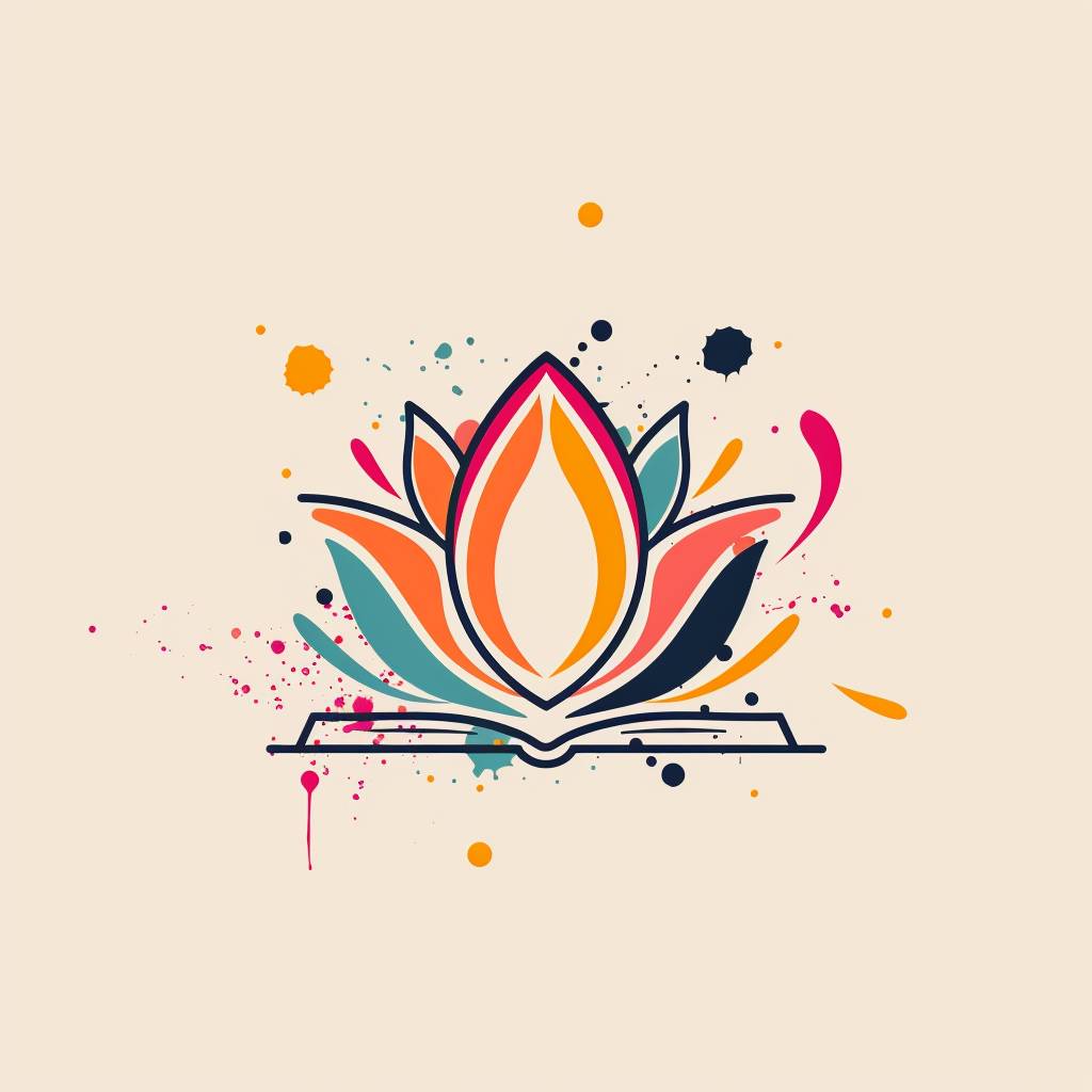 A minimalistic vector logo made of lines featuring a lotus and a book, with simple shapes, modern design, and 4 vibrant colors with paint splatters.