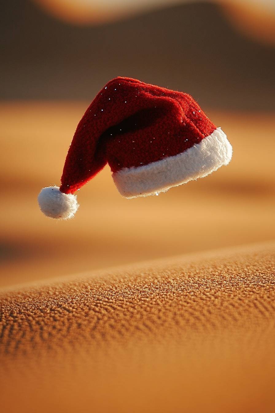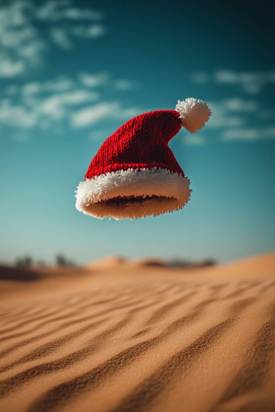 Design of a small Christmas hat floating in the Dubai desert