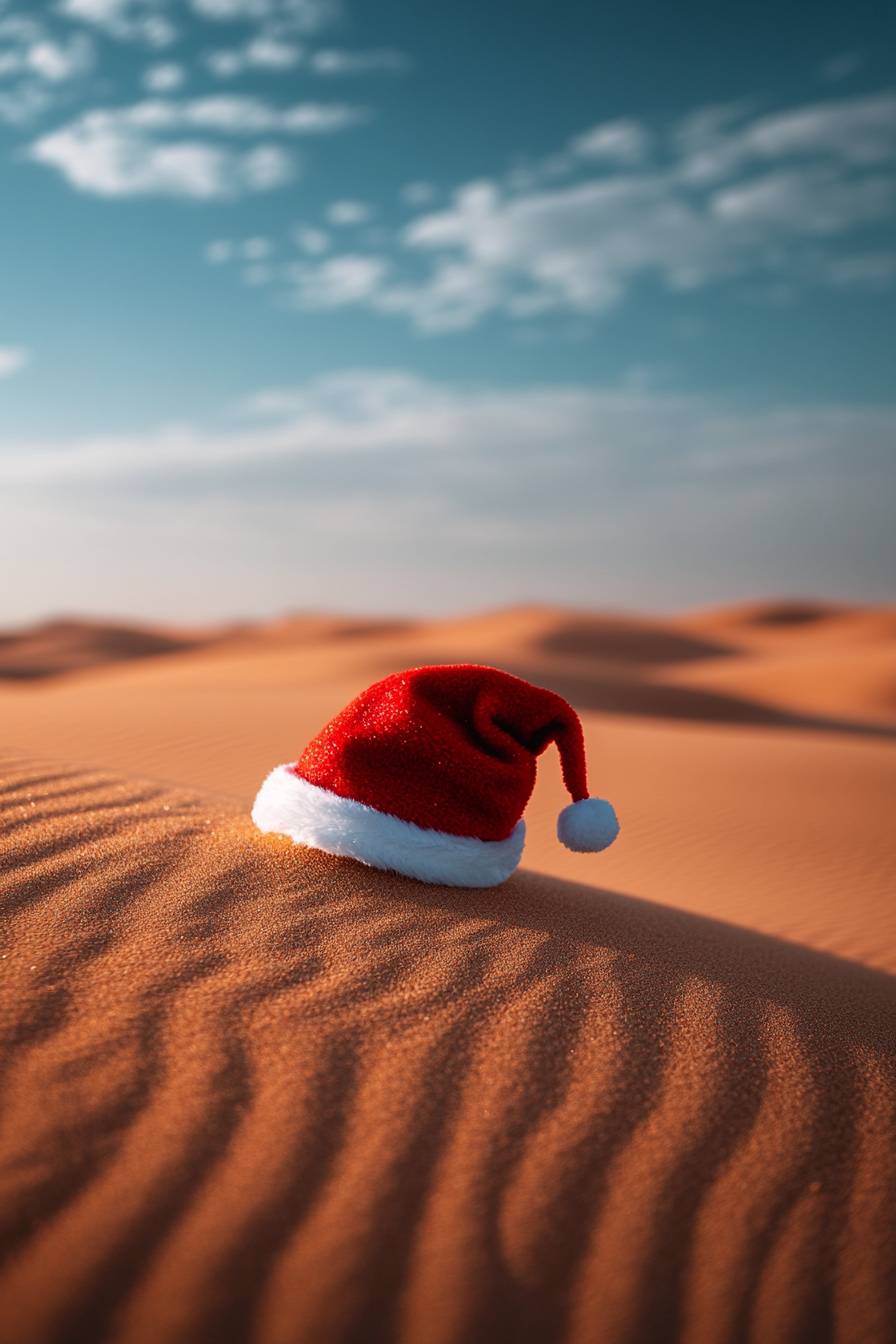 create a small Christmas hat floating in dubai desert and make this as a design company --stylize 250 --v 6.1 --ar 2:3