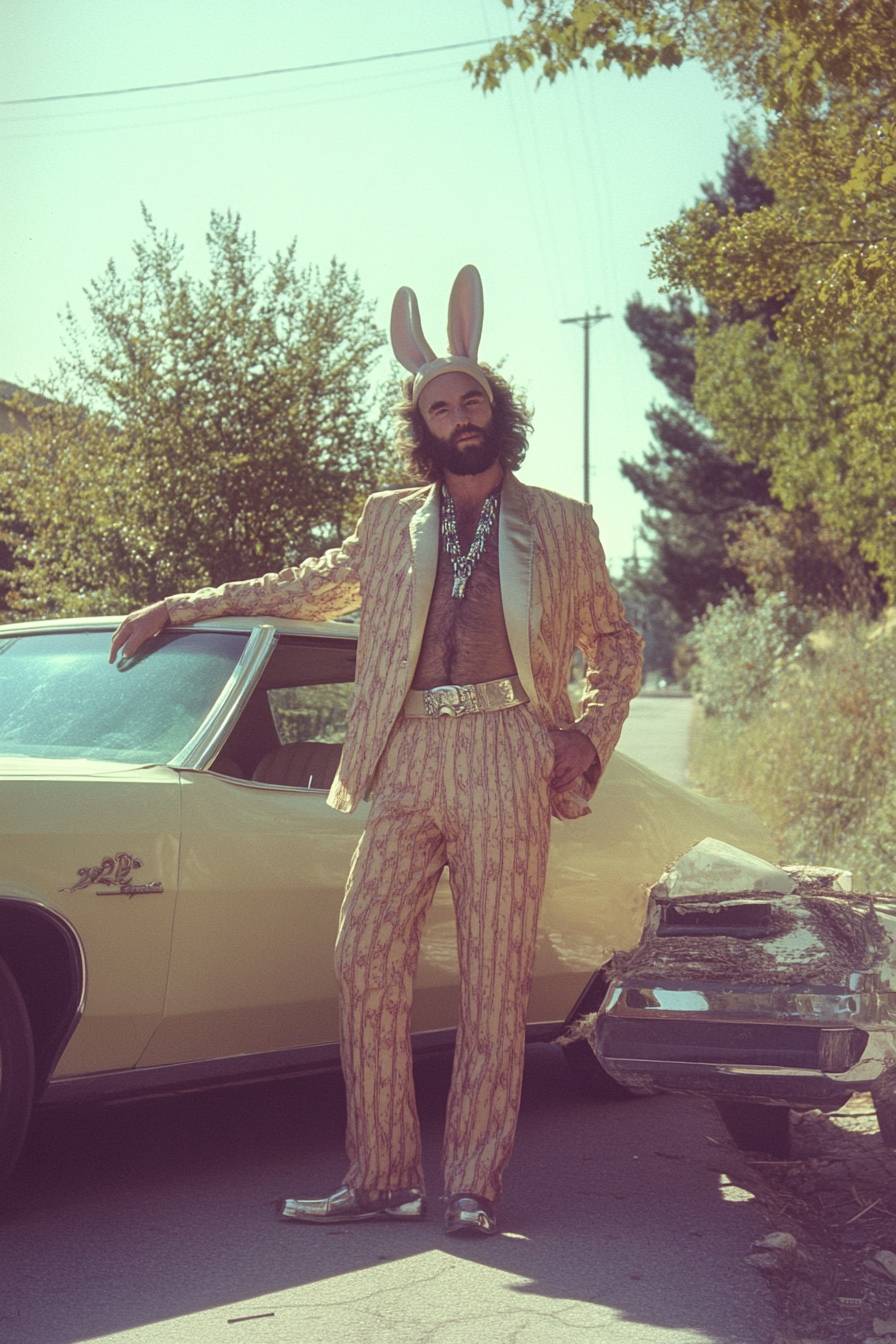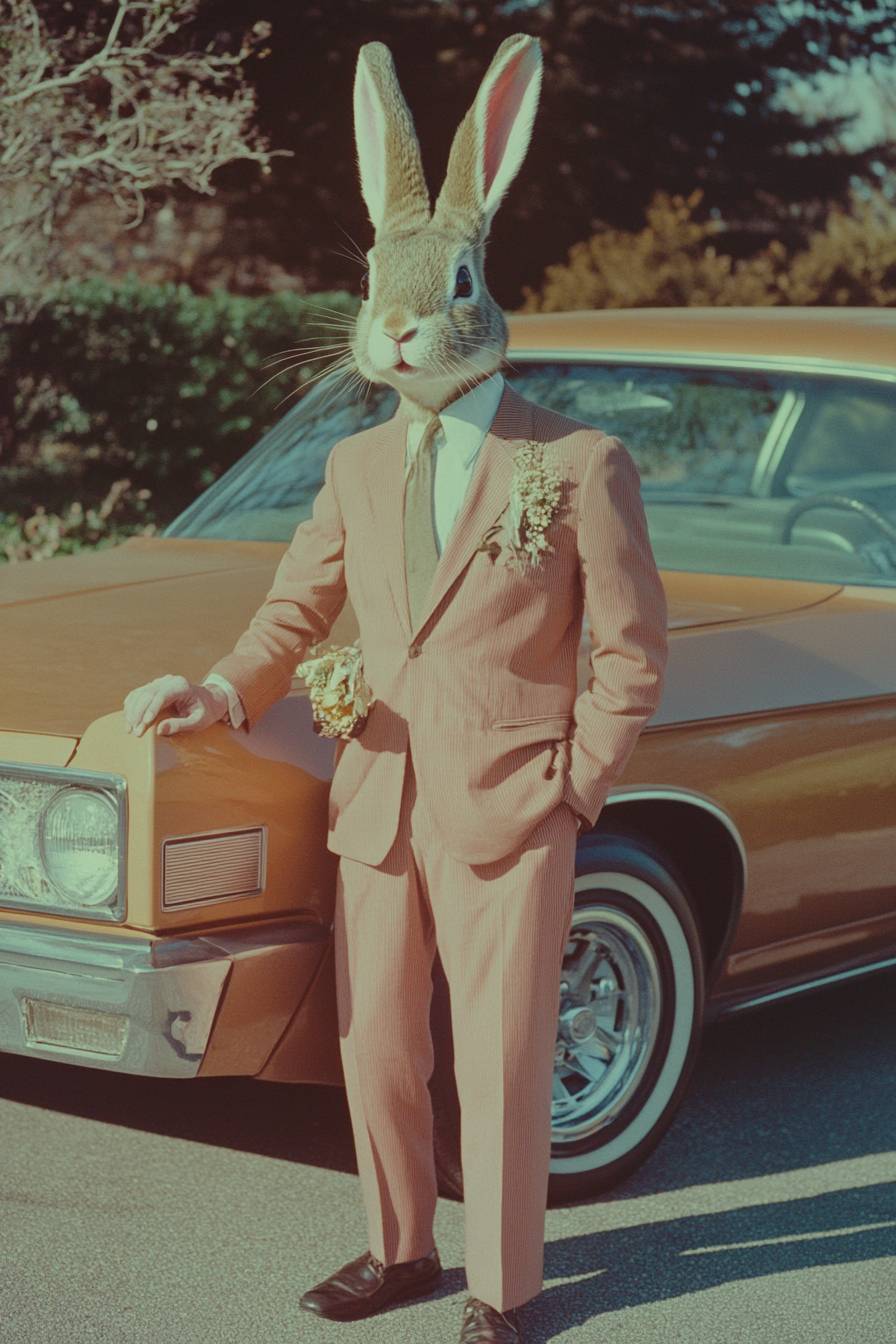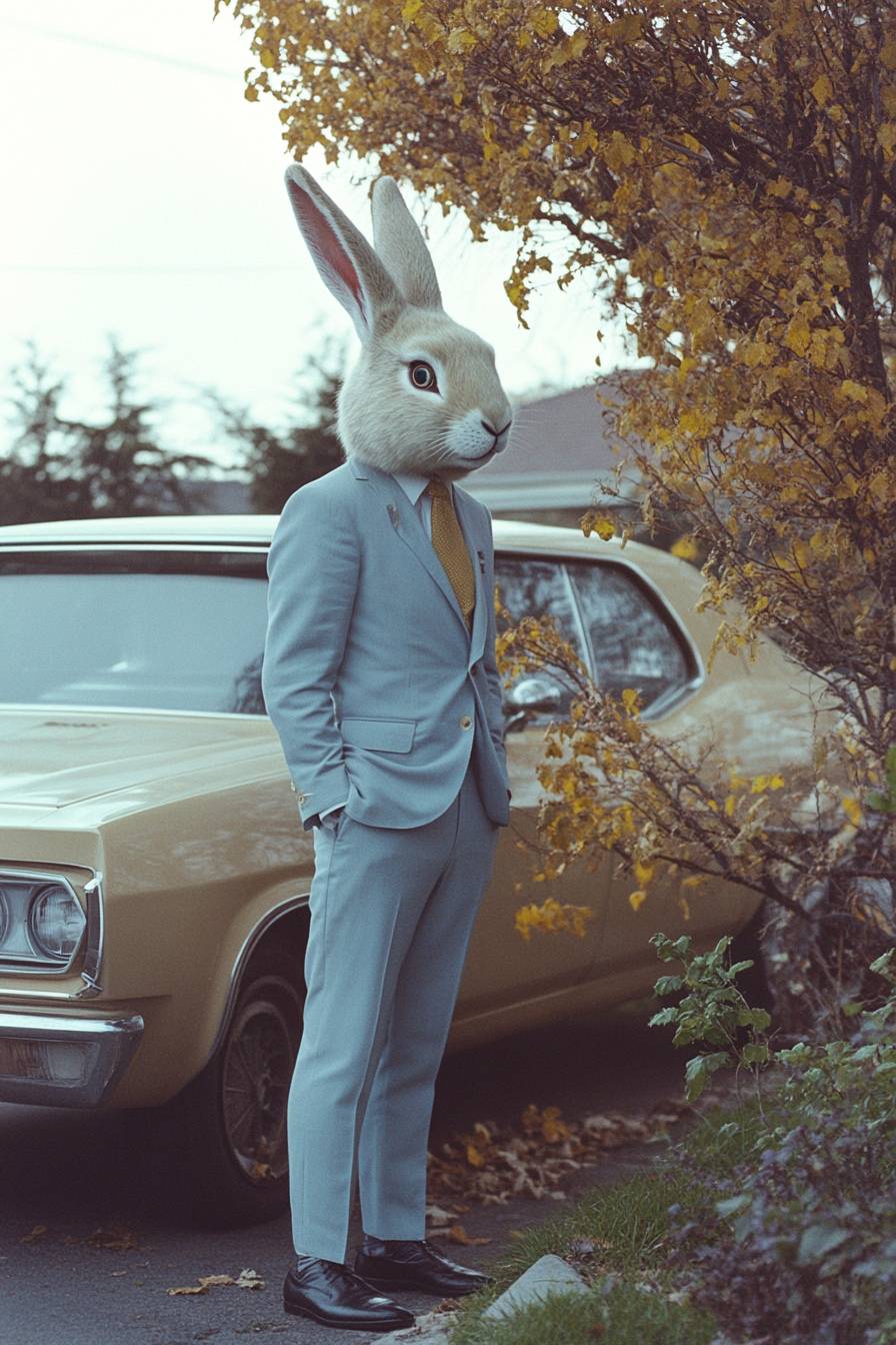 A 35mm color photograph of a man with a rabbit head next to a classic car from the 1970s.