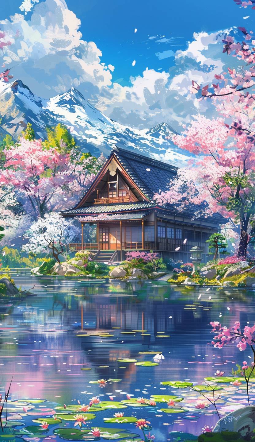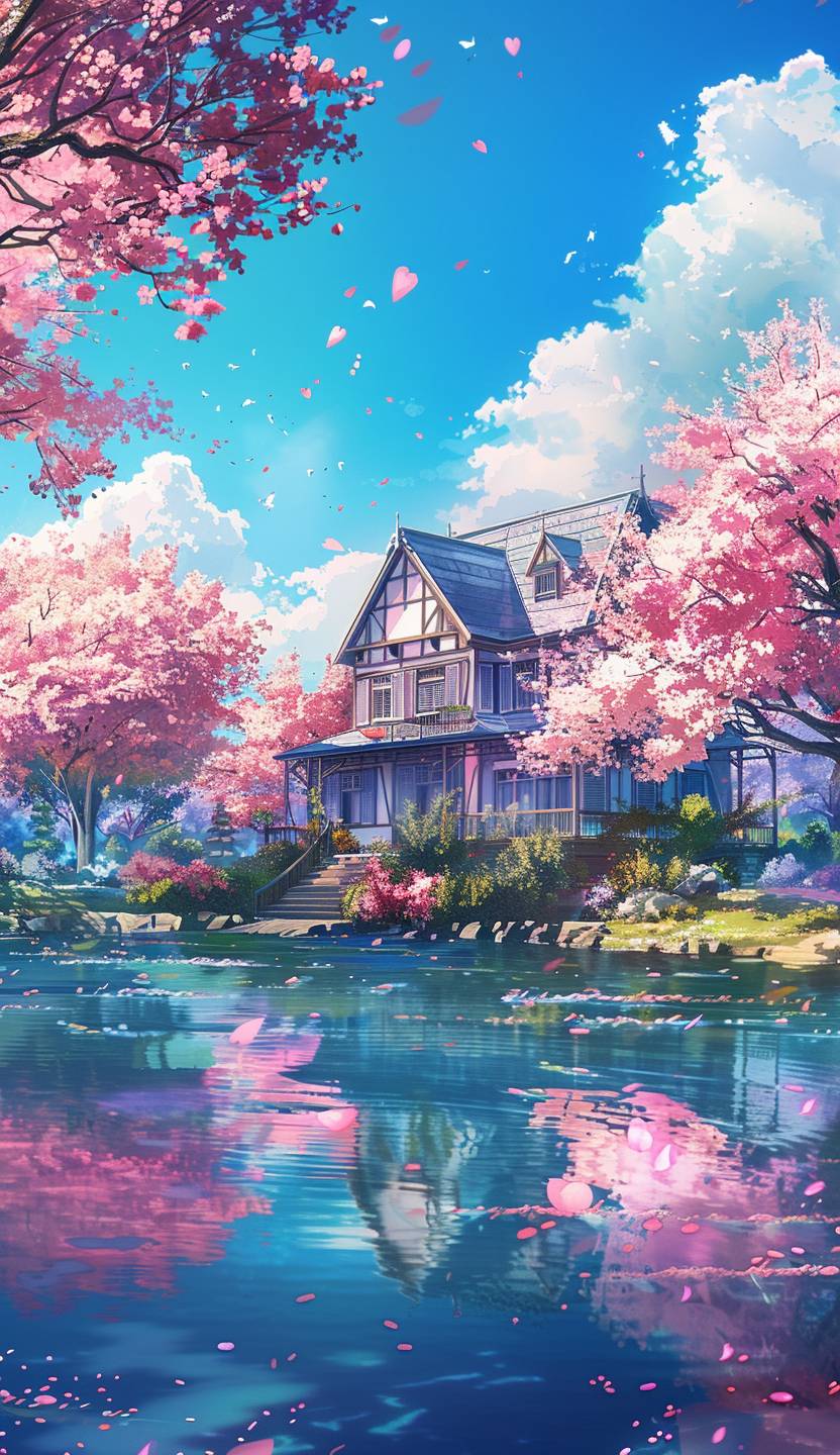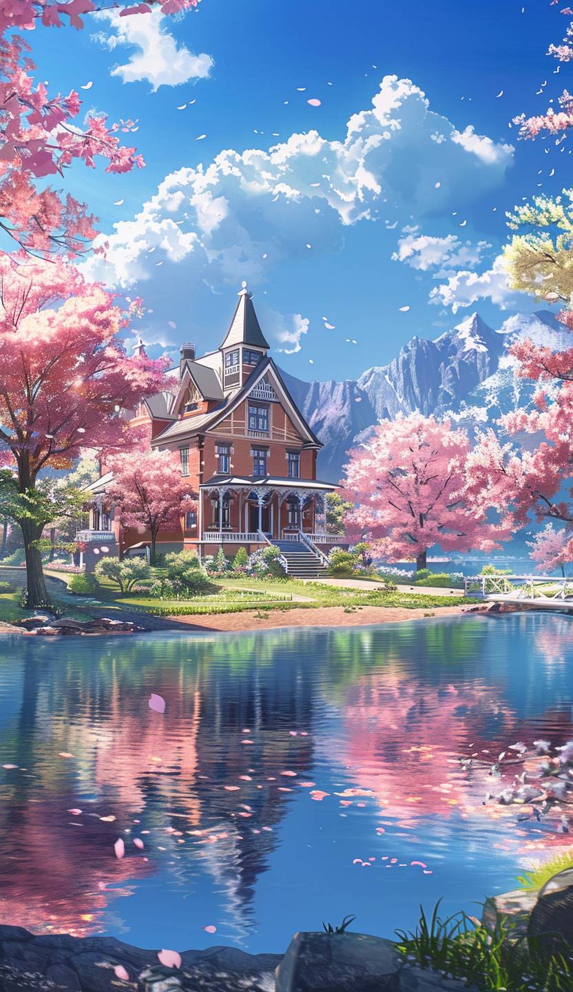 A beautiful house in the background, surrounded by blooming cherry blossom trees and a lake with clear blue skies and white clouds. The painting style is colorful in the style of anime. --ar 37:64 --v 6.0