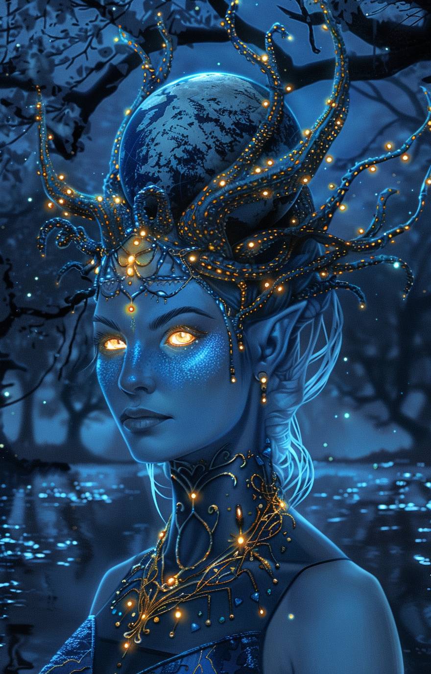 A beautiful blue woman with an elegant figure stands in front of the Earth, adorned with ancient silver jewelry and futuristic LED lights, surrounded by a dark night sky and flowing water.