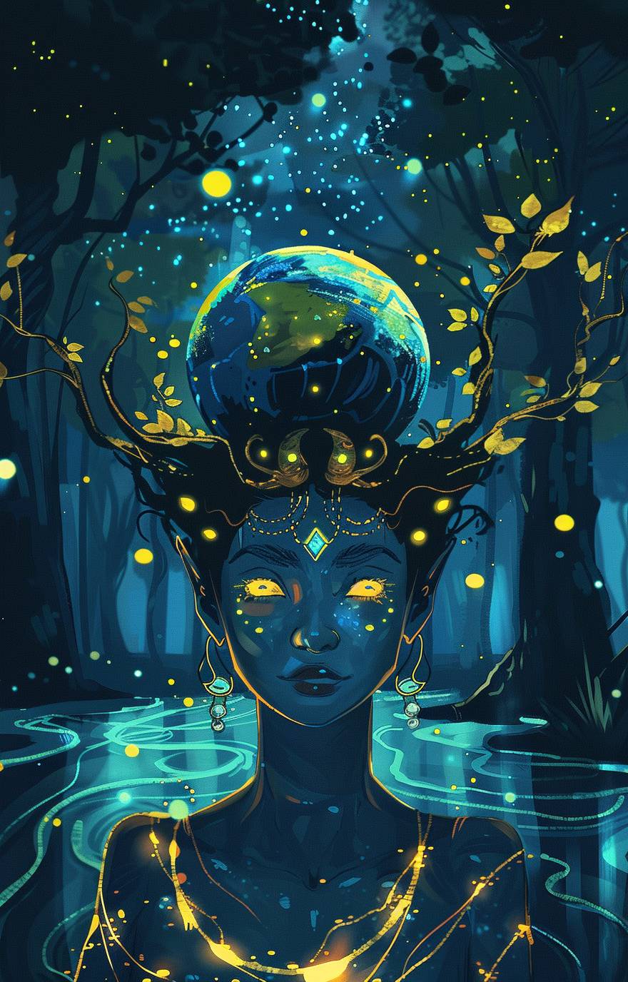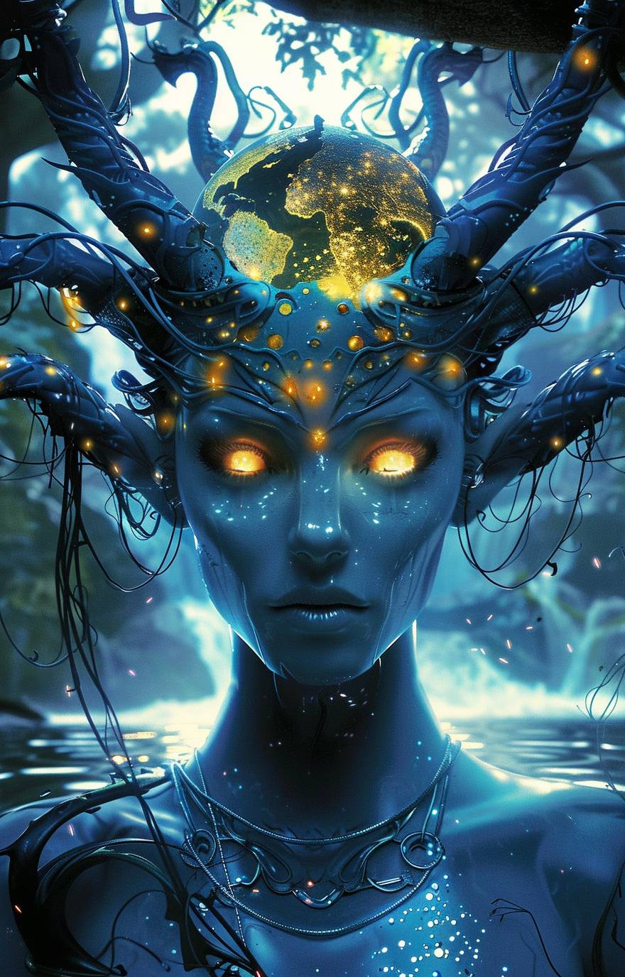 A beautiful blue woman with an elegant, slender figure and glowing eyes stands in front of the Earth on her head. She has many metallic vines growing from behind her ears to form two metal horns that stand upright above each ear. The background is a dark night sky with trees and stars. Her chest skin glows a golden yellow like fire under sunlight. Water flows around her, creating ripples. She wears ancient silver jewelry and carries futuristic LED lights in a cinematic style.