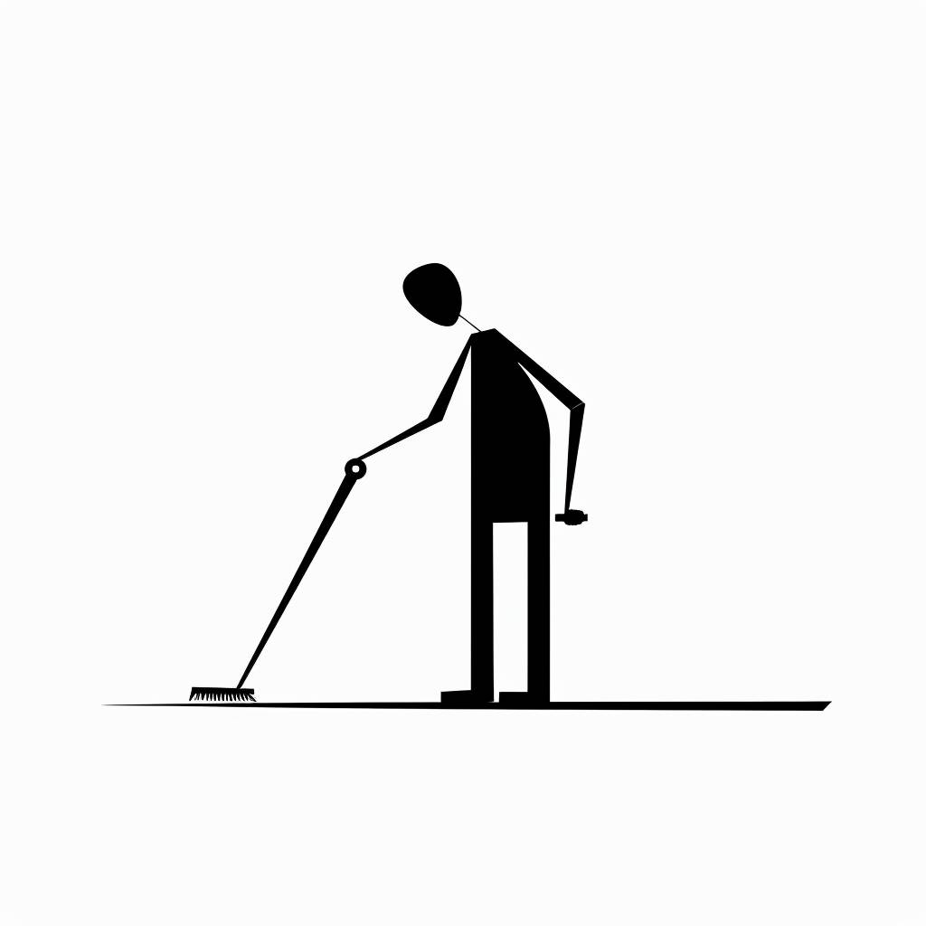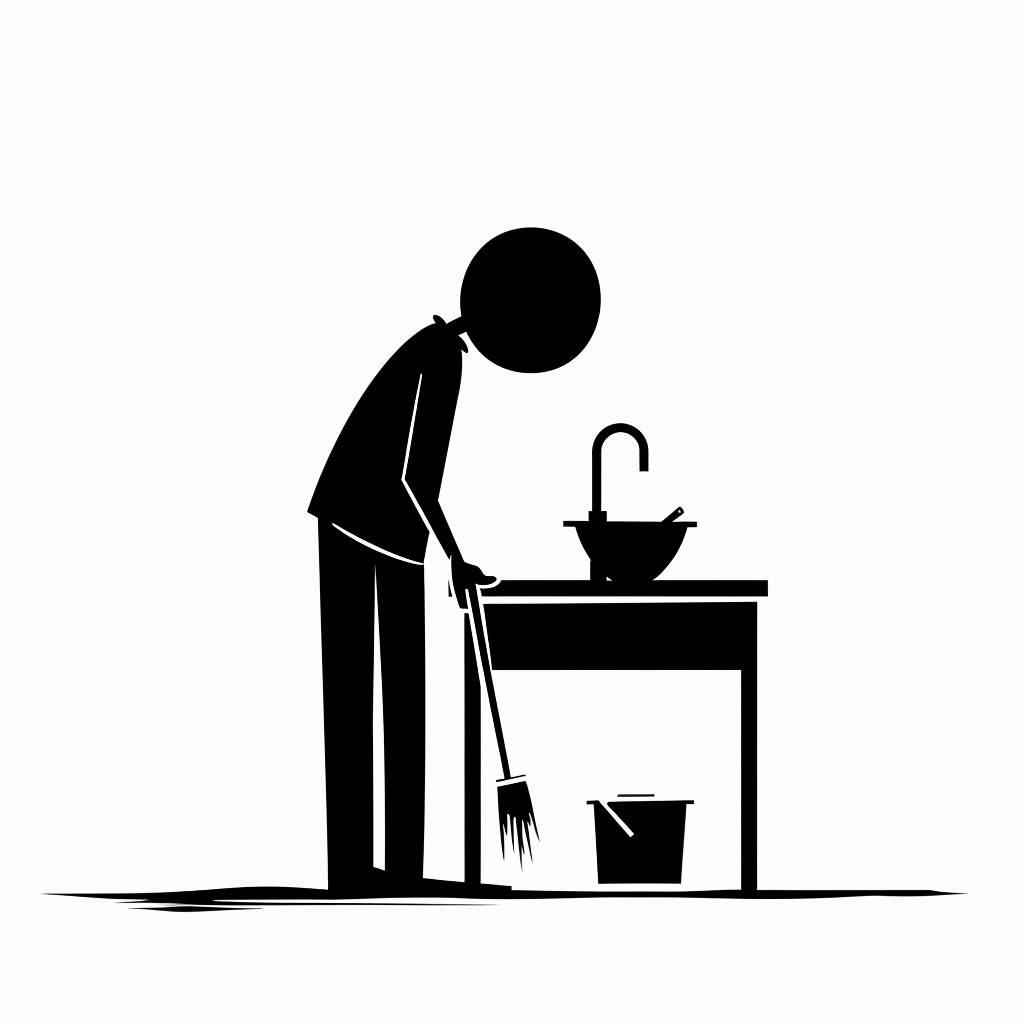 A simple, minimalistic image using a figure with clean lines and high contrast. The background should be white, and the figure should be black with black outlines. [Desk cleaning chores], minimal style