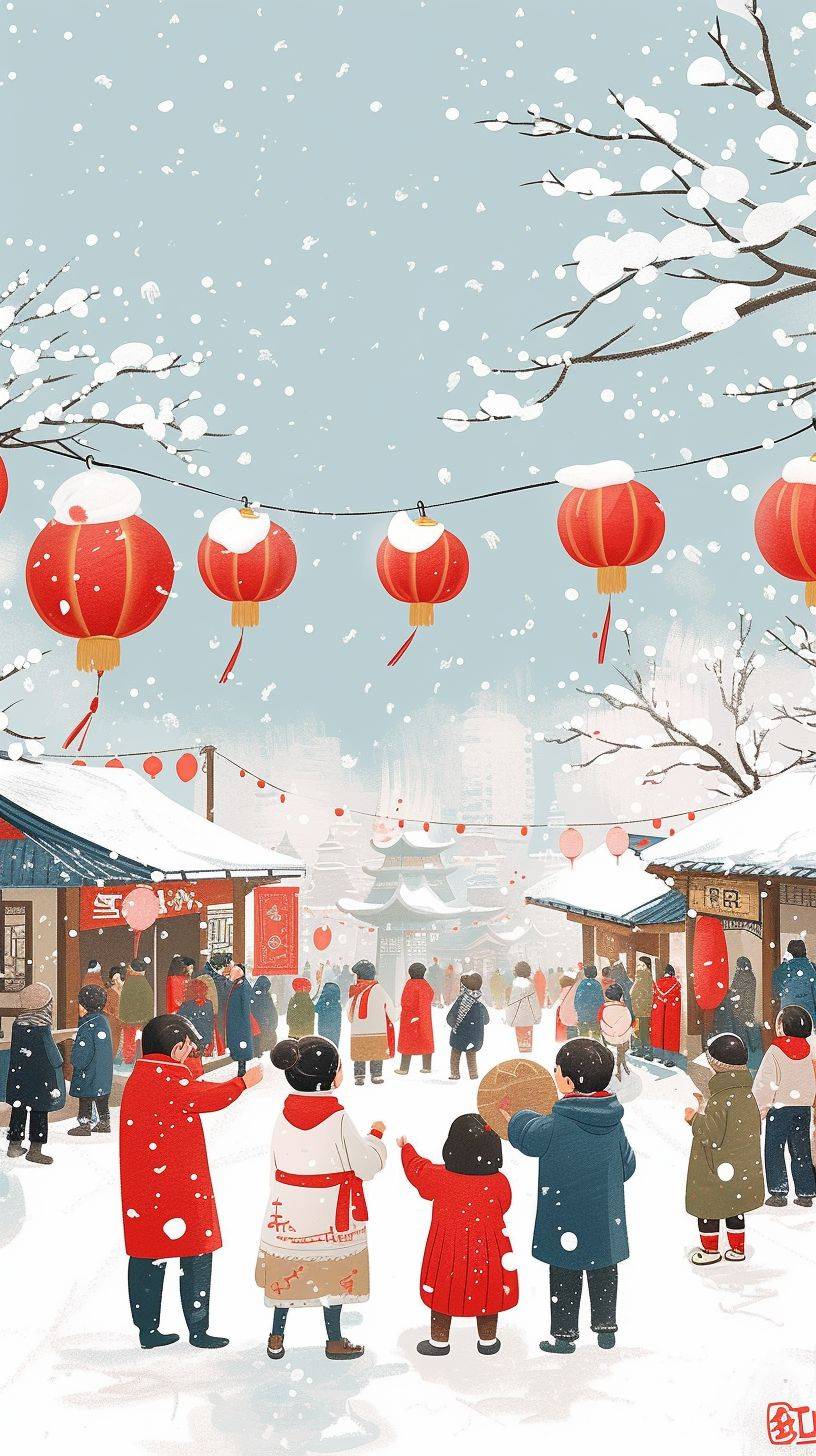 On a snowy Chinese New Year night, children visit friends in new clothes, creating a lively and warm atmosphere of cultural celebration.