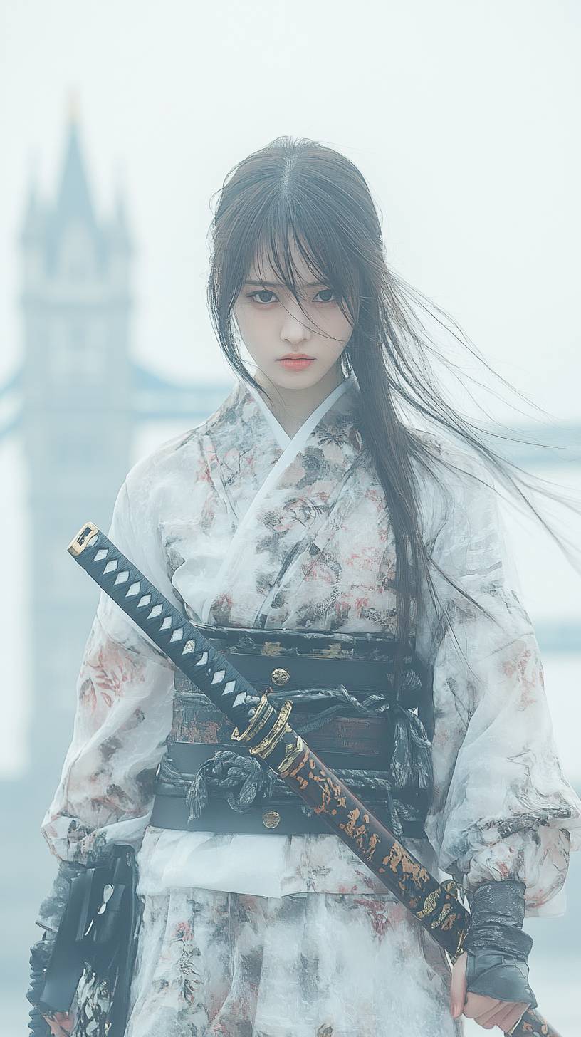 a captivating scene of a Japanese woman embodying modern and traditional beauty, dressed in a kimono-style top with a mix of camouflage and floral patterns, cinched with a black obi. Her straight long hair sways gracefully as she holds a katana with both hands, radiating calm confidence. The backdrop features Tower Bridge shrouded in morning mist, creating a soft and serene atmosphere. Hyper-realistic, intricate details, cinematic lighting, harmonious blend of classic London and modern Japanese style --ar 9:16 --style raw --profile s74mlo5 --stylize 300 --v 6.1
