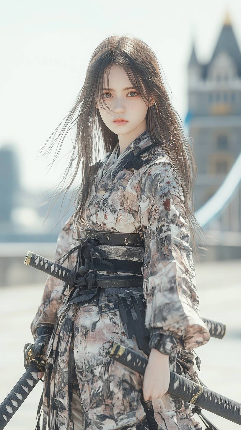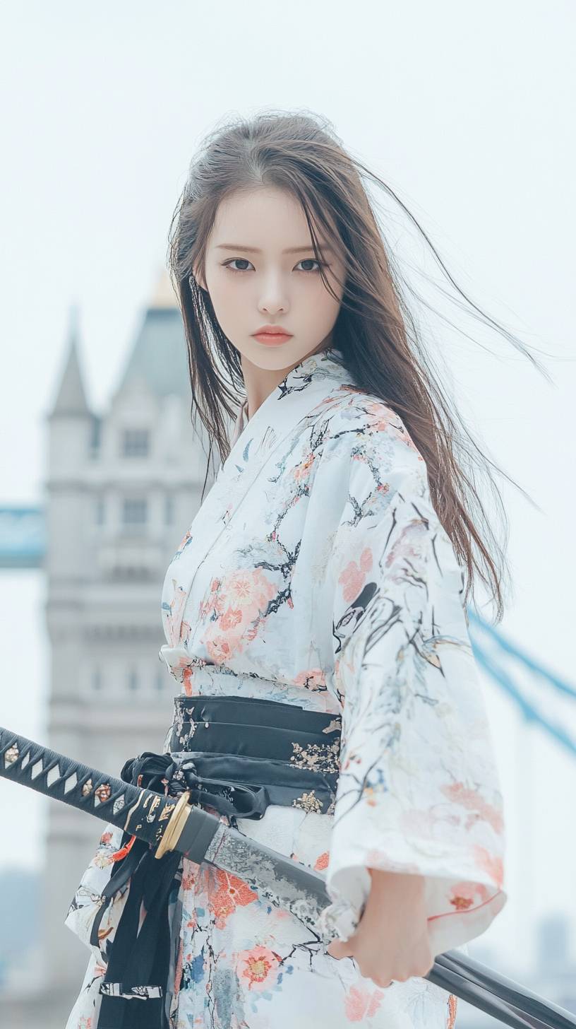 A Japanese woman embodies modern and traditional beauty, holding a katana with Tower Bridge in the background.