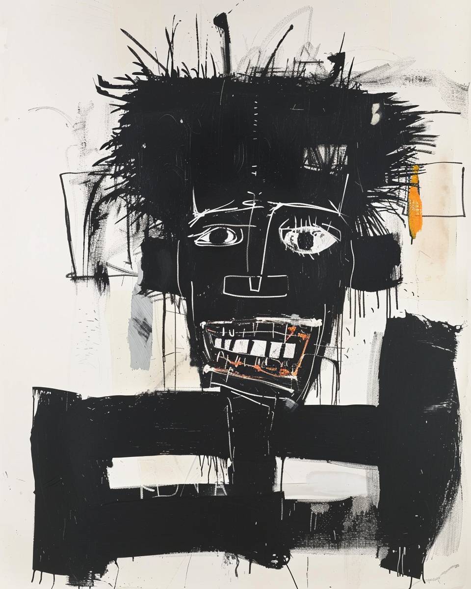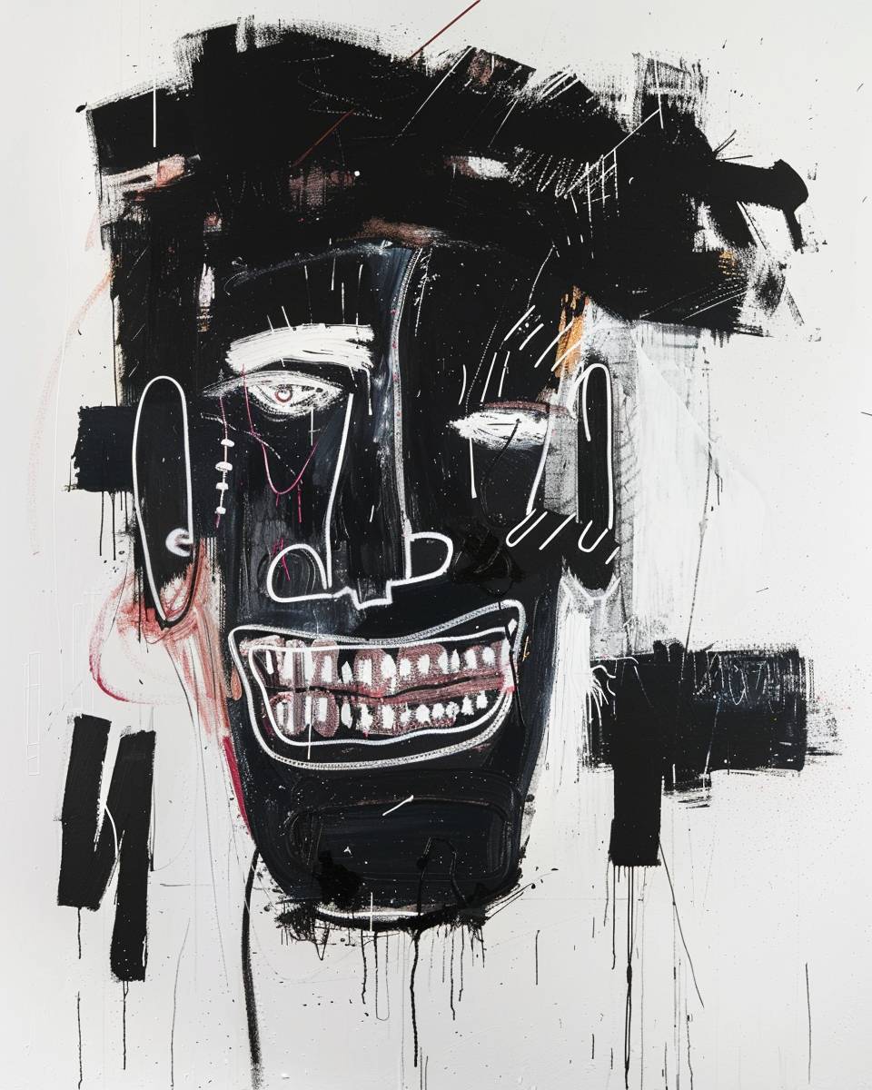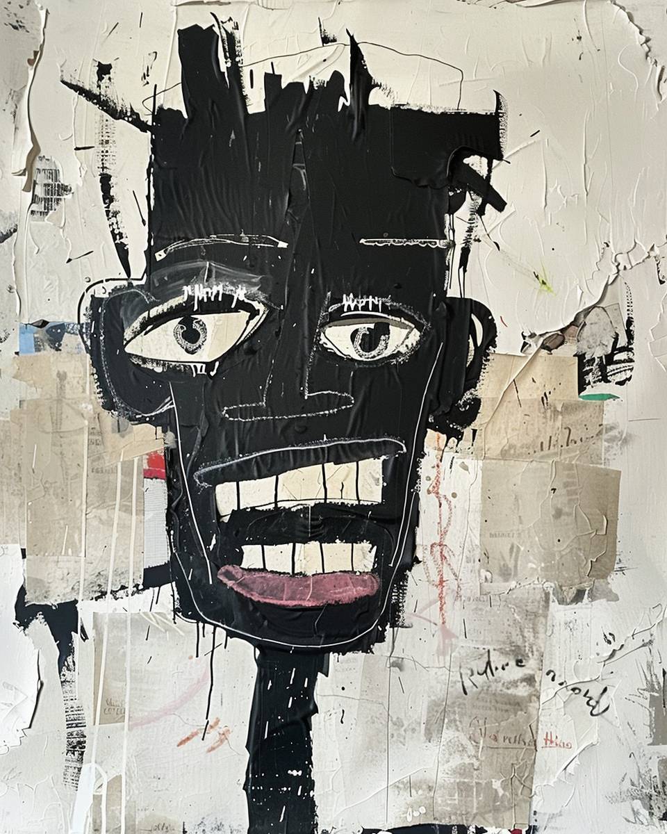 a black face, resembling a comedian, smiling, abstract collage style mixed media, in the style of Basquiat, on a white background --style raw --ar 4:5 --iw 3 --v 6.0