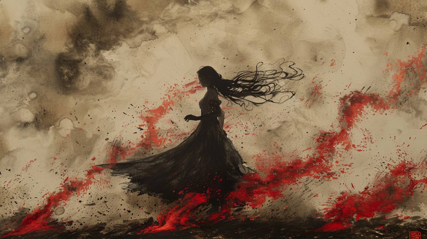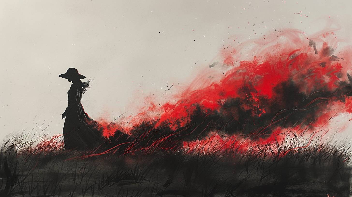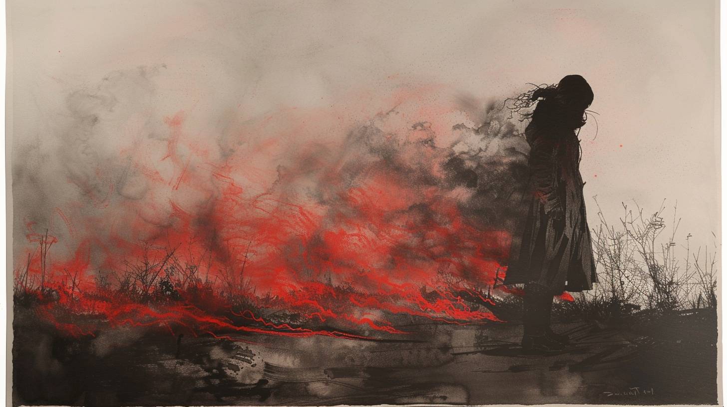 smokey charcoal drawing , woman in smoke of campfire embers , rising slowly , red color in embers only sakuga animation cel --ar 16:9 --stylize 250 --v 6.0
