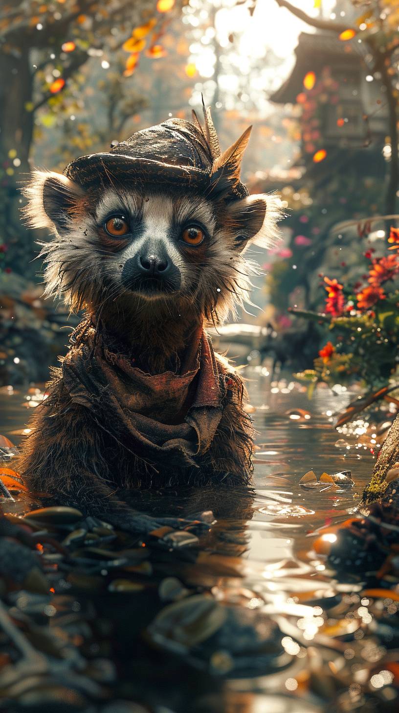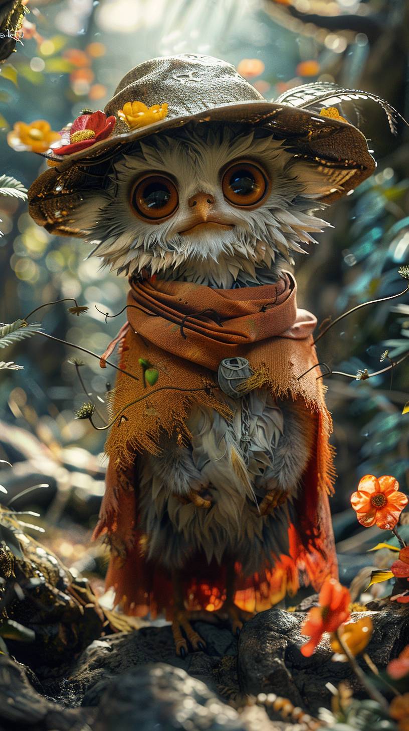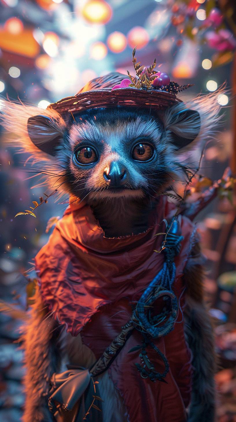 Photo from an enchanted world landscape, influenced by Tim Burton and Wes Anderson styles, detailed ground, rocks, forest track, giant plants, complex, giant, sympathetic paradise lemur-like creature with a witcher's hat, big eyes, transparent wings, colorful biomes, wet environment, colored flowers, eyed plants, furry animals, big birds flying, alien insects, luminous ghosts, gradient horizon, alien sunset, sun rays, ultra-detailed textures, beautiful view, amazing visual, Canon EOS R5 camera, wide panorama vertical