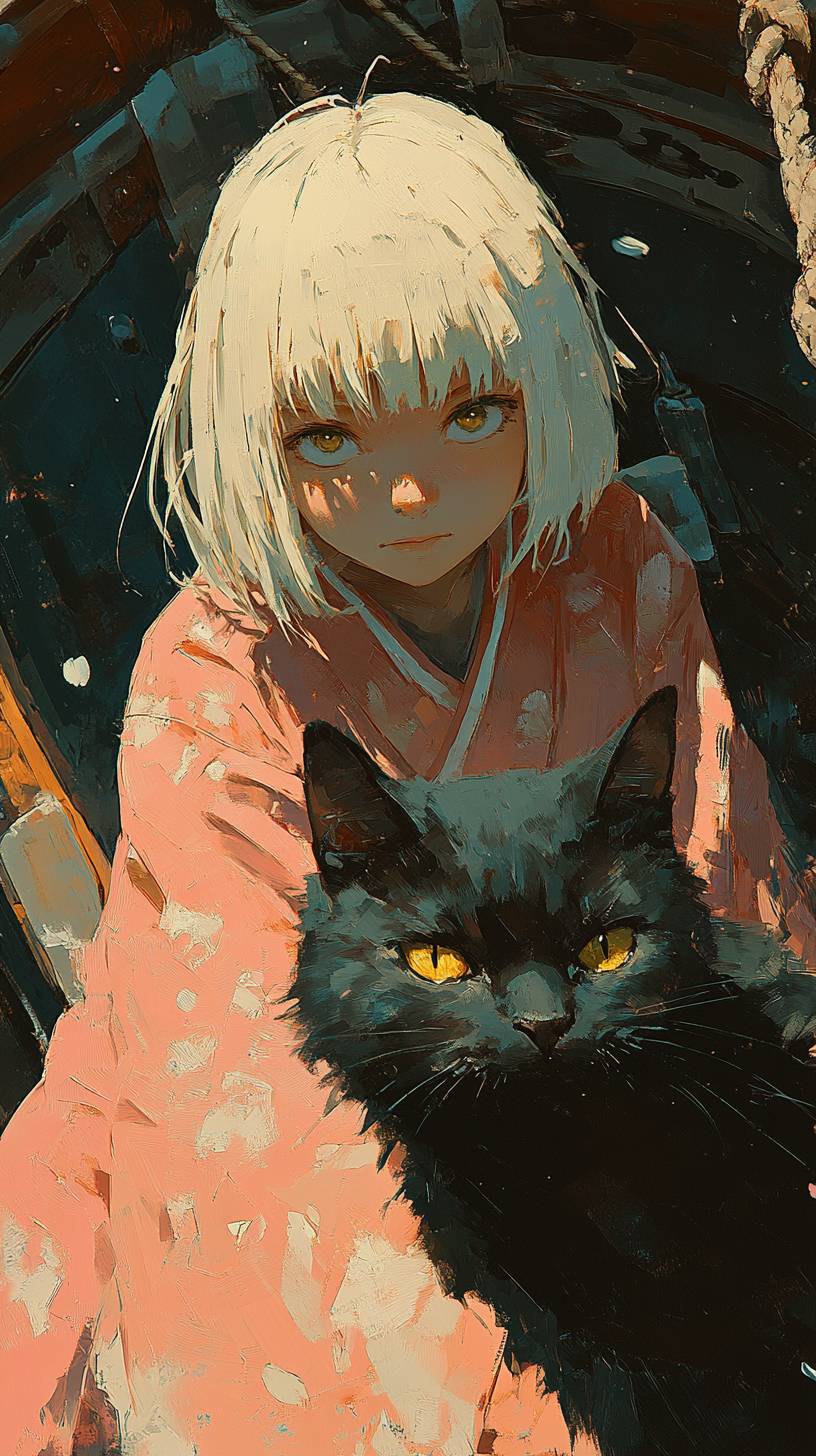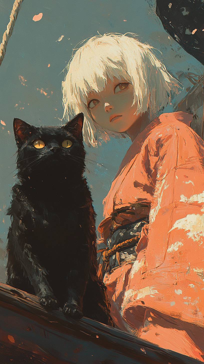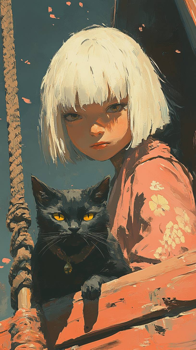 A close-up of a serene and enchanting moment, focusing on a young girl and a sleek black cat aboard a gracefully floating wooden boat. The girl is captured mid-gaze, her delicate features framed by her short, bobbed white hair, which shimmers softly in the golden hues of the setting sun. Her deep, contemplative eyes reflect the subtle glow of the magical ambiance, drawing the viewer into her tranquil and introspective world. She wears an exquisite kimono of pastel pink with intricate golden embroidery, its patterns resembling flowing cherry blossoms, adding a touch of elegance to her youthful charm. Her gentle smile carries an air of wonder, perfectly matching the ethereal setting. Beside her, the black cat sits poised with quiet confidence, its sleek, velvety fur glistening under the warm light. Its large, expressive yellow eyes are fixed intently ahead, exuding both intelligence and a sense of calm guardianship. The cat’s body is relaxed but alert, its tail curling lightly around its paws, adding a graceful balance to its form. A soft breeze ruffles the girl’s hair and the cat’s fur, creating a dynamic sense of movement. In the background, only hints of the surroundings can be seen, allowing the girl and the cat to take center stage. The blurred outlines of the boat’s intricate carvings frame the duo, while faint traces of glowing runes beneath the boat suggest its magical nature. The sky behind them is awash in pastel gradients of pink and gold, with faint petals of cherry blossoms drifting through the air, adding a sense of gentle beauty to the intimate composition. This close-up captures the quiet bond between the girl and the cat, set against a backdrop of otherworldly tranquility.