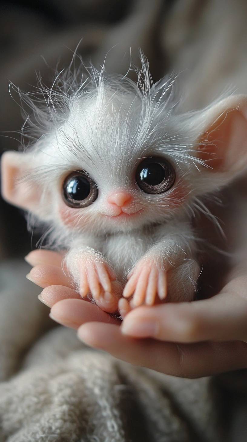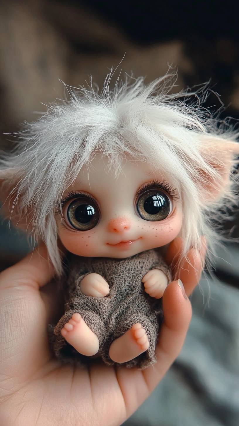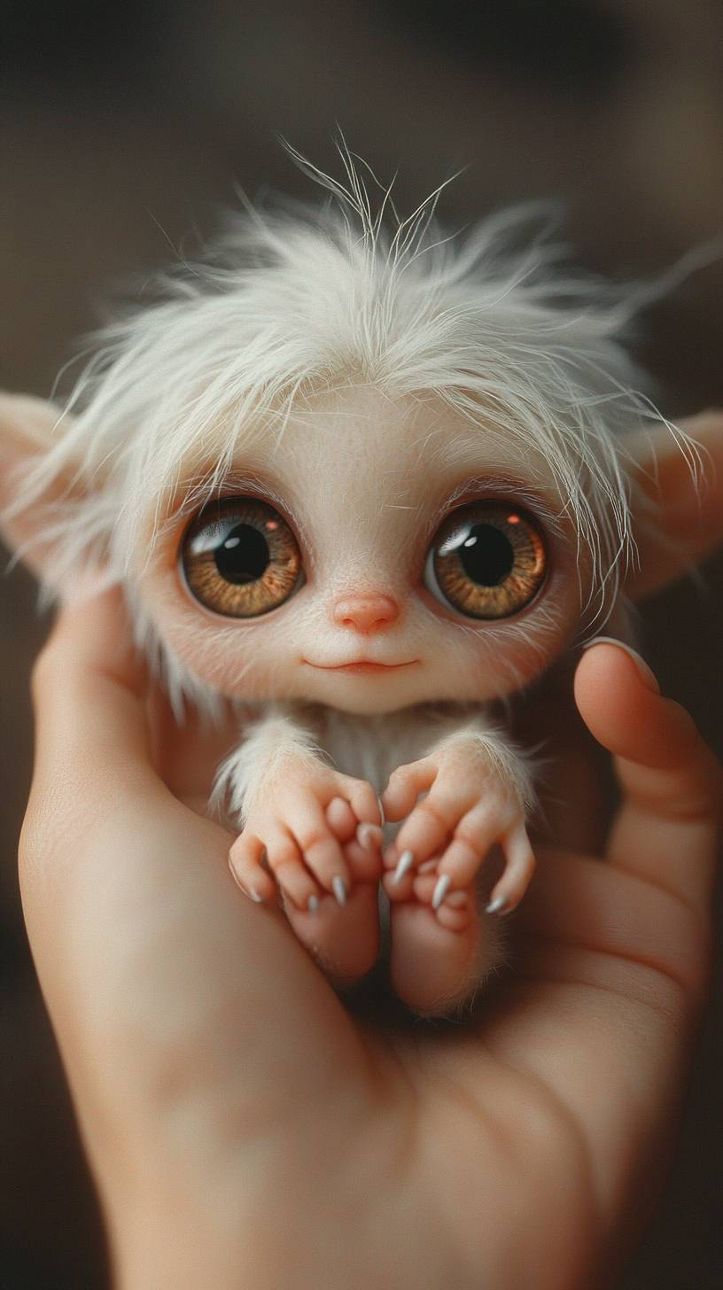 The cutest miniature [dwarf] you've ever seen, with white hair, big eyes and long eyelashes, is undoubtedly the cutest and most charming, being held in the arms of its owner --ar 9:16 --v 6.1