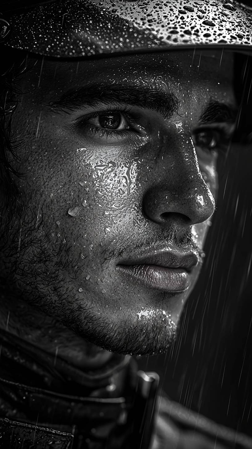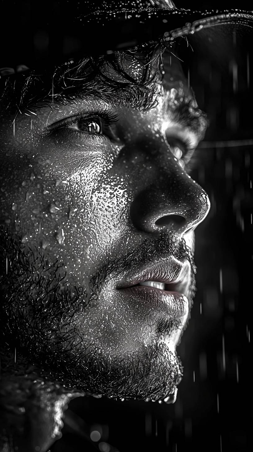 monochrome studio, xenon lighting, high resolution, rendering, 8k, computer graphics, formula 1 driver face Lewis Hamilton, rain, high contrast, timeless, --chaos 5 --ar 9:16 --quality 2 --style raw --stylize 750 --v 6.1