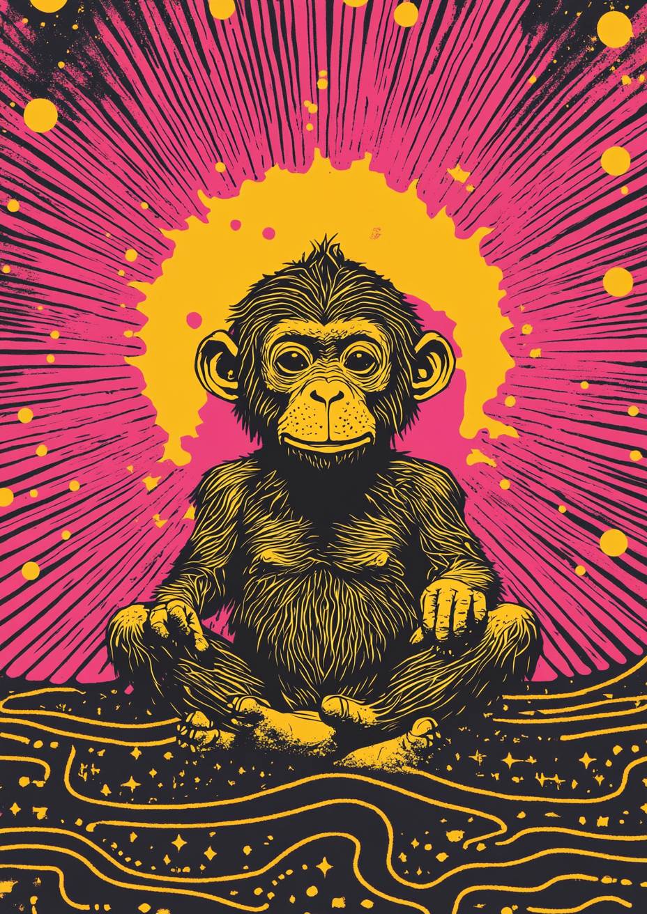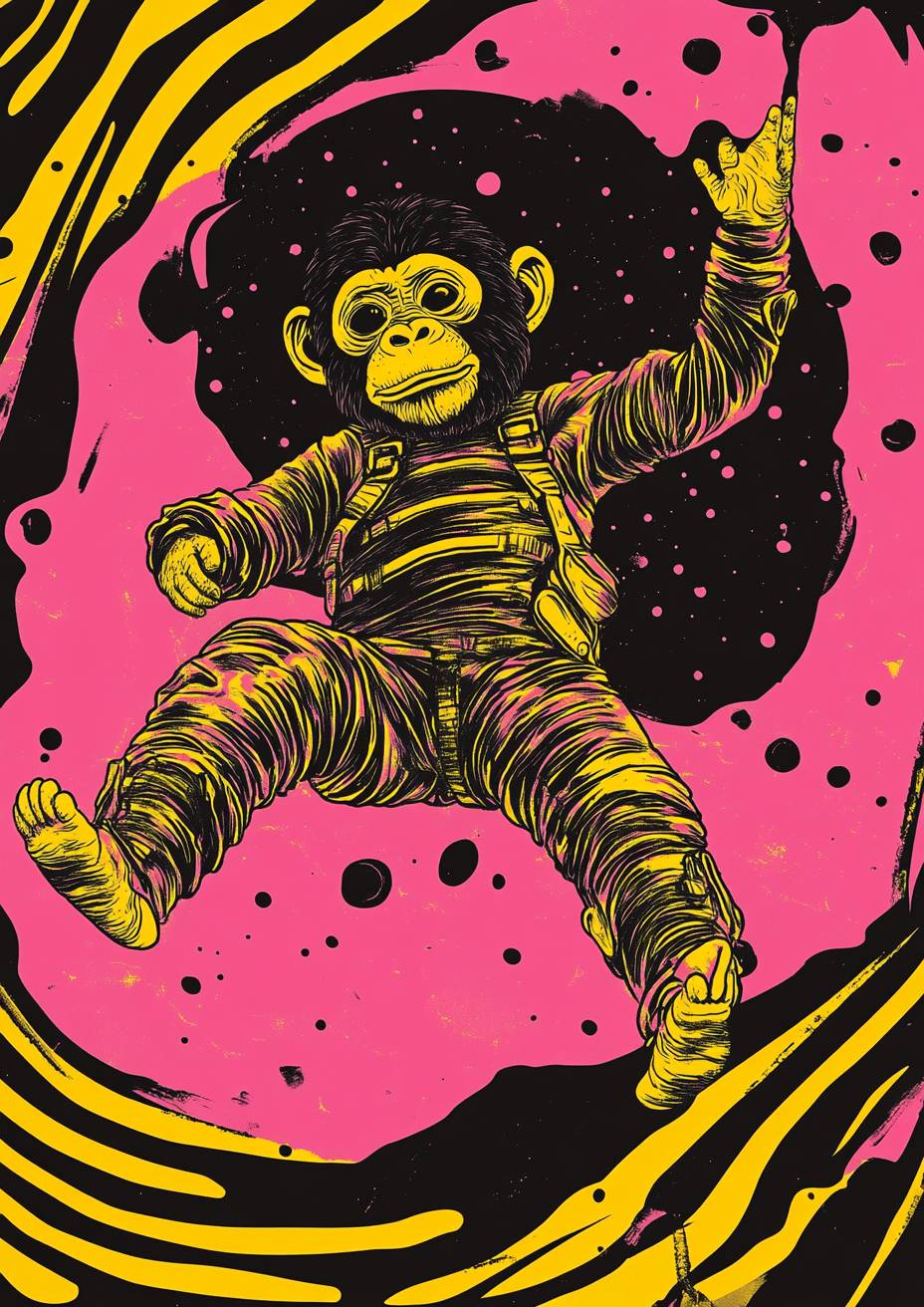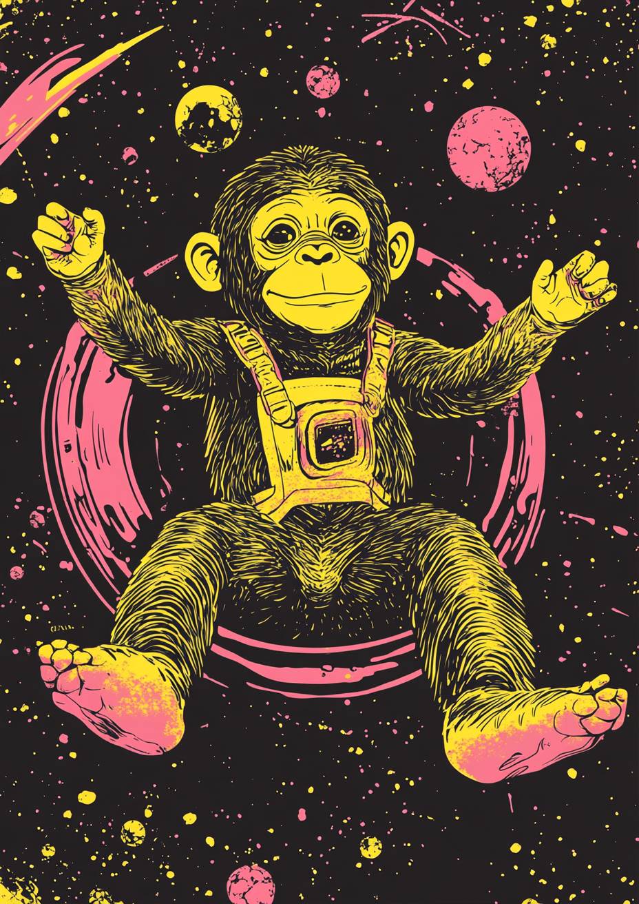 A psychedelic concert poster that relies on yellow, pink and black colors. The central figure is a baby chimpanzee floating in outer space. The overall style resembles vintage screen printing with 80s punk influence in the style of vintage screen printing. keep the line and detail very simple --ar 5:7 --v 6.1 --style raw