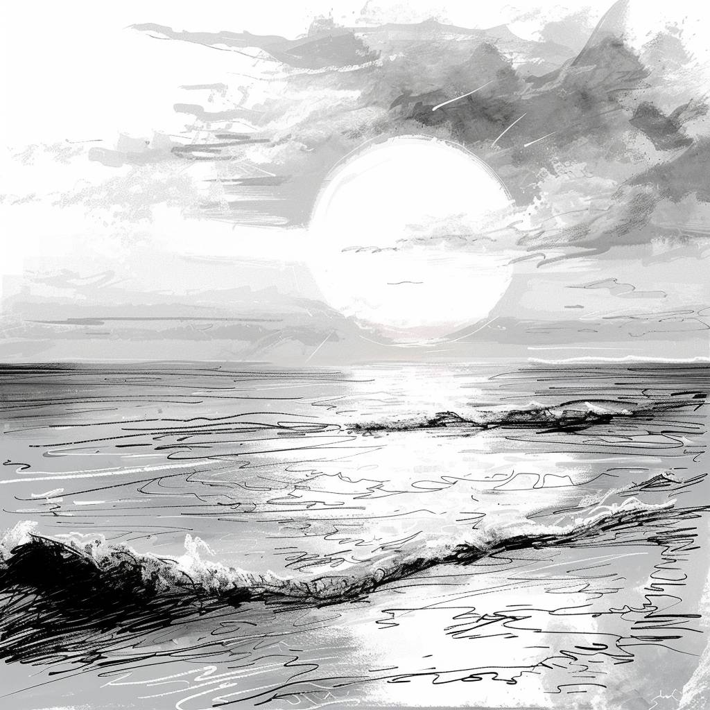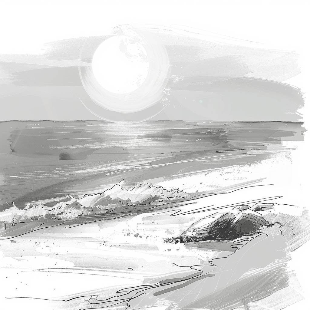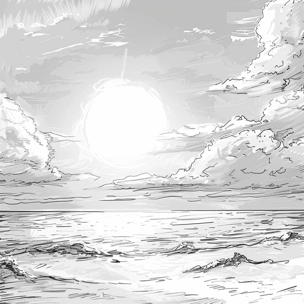 A manga sketch of a morning sunrise beach in the style of Takashi Murakami, featuring rough brush strokes and hand-drawn elements.