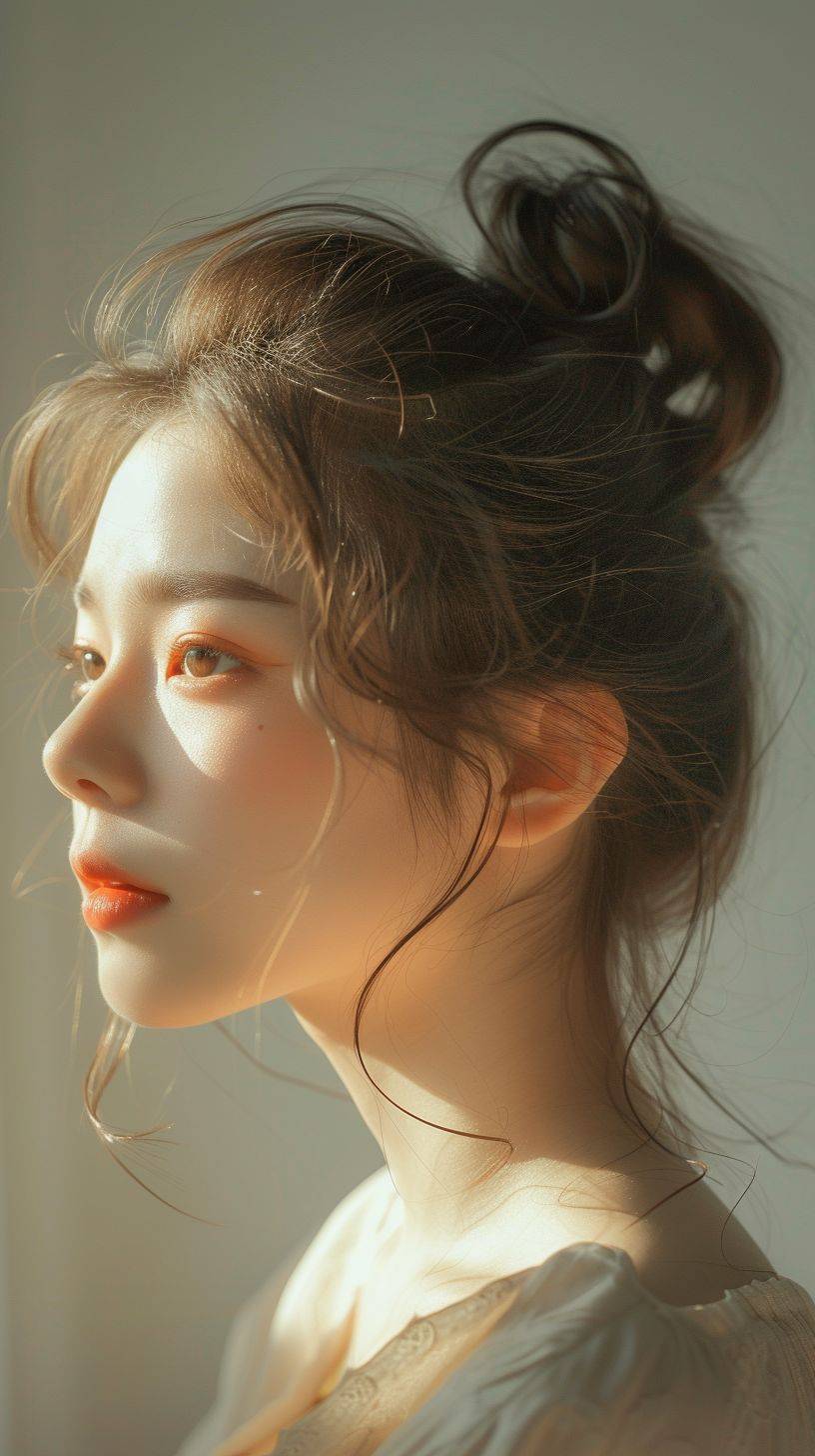 chinese woman, cute, salon model, with a bun hairstyle, brown hair color, looking slightly diagonally, against a white background, with a light shining on her. --ar 9:16 --v 6