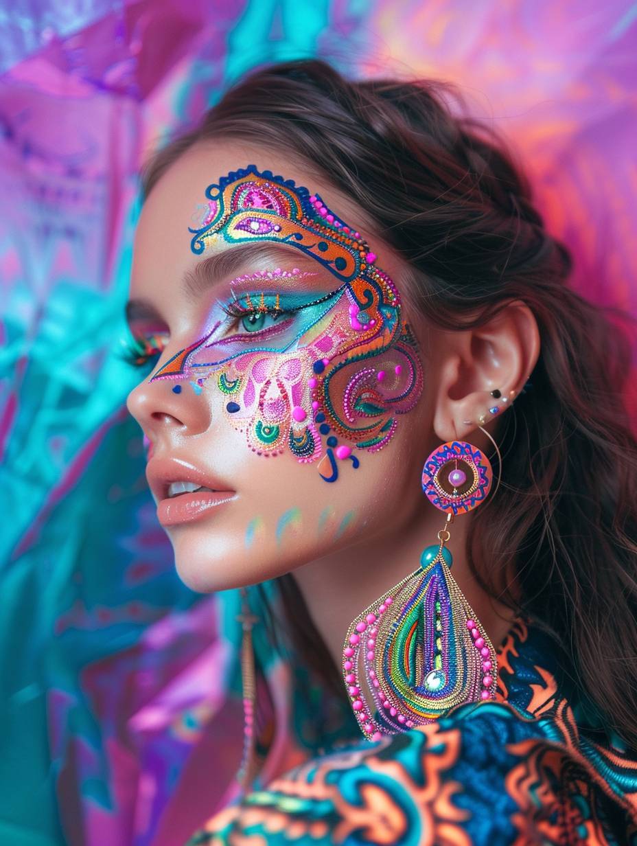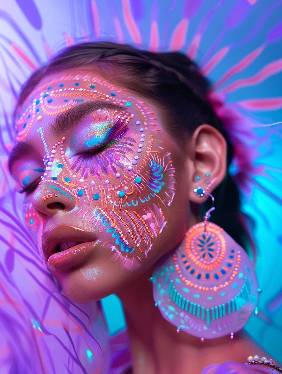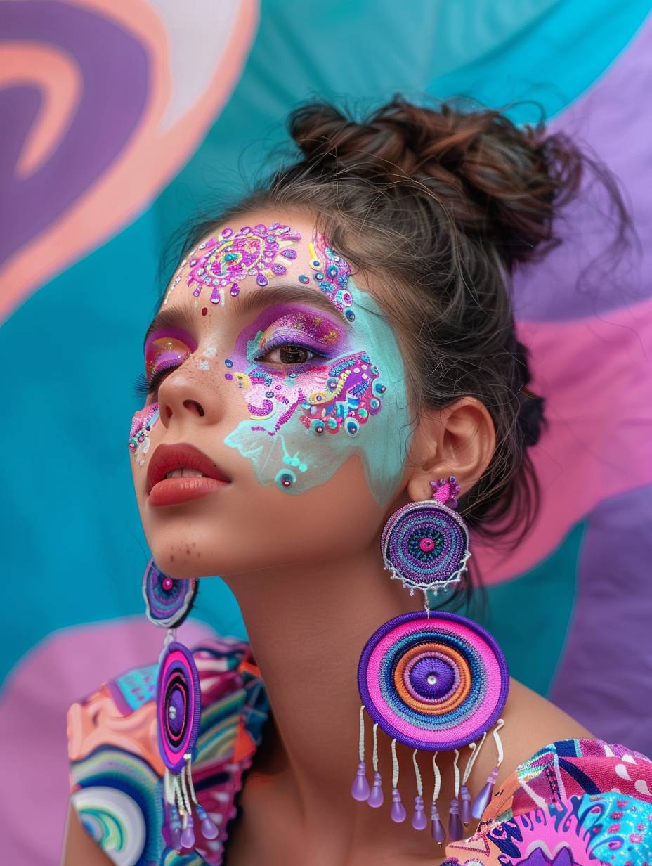 A beautiful girl with an intricate and colorful pattern on her face wears large earrings. Her style is reminiscent of Australian Aboriginal art. The background is abstract, with shades of purple, pink, and turquoise, creating a surreal atmosphere. Her makeup features pastel eyeshadow.