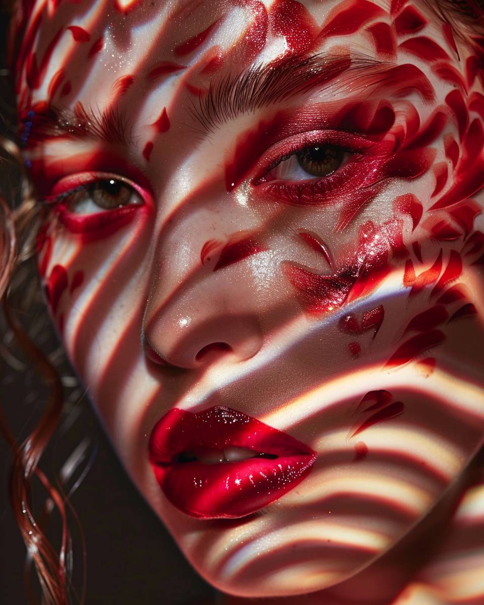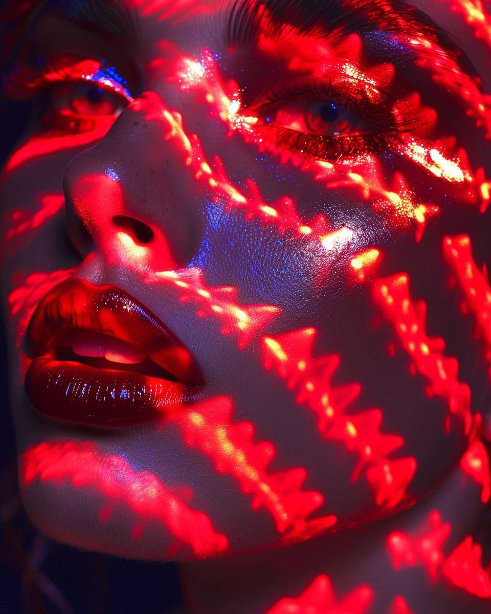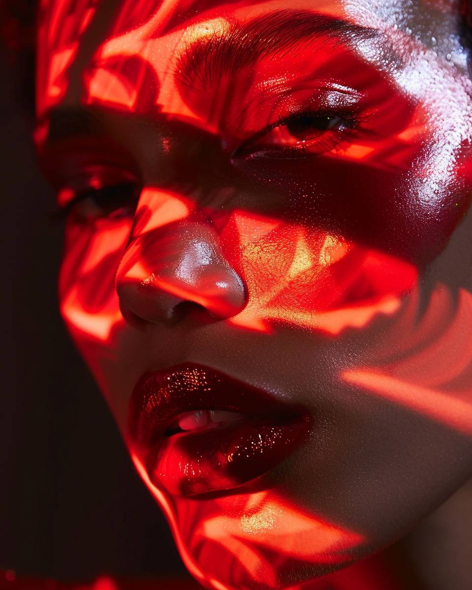 A close-up of a model's face with dramatic, high-contrast lighting creating striking shadows. The lighting features red tones that cast abstract patterns across the model's face. The makeup is bold with glossy red lips and shimmering eyeshadow. The overall effect is intense and high-fashion. --ar 4:5 --style raw --stylize 50 --v 6.0