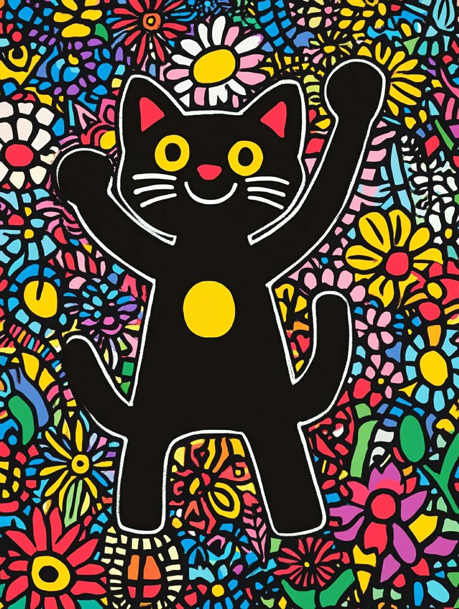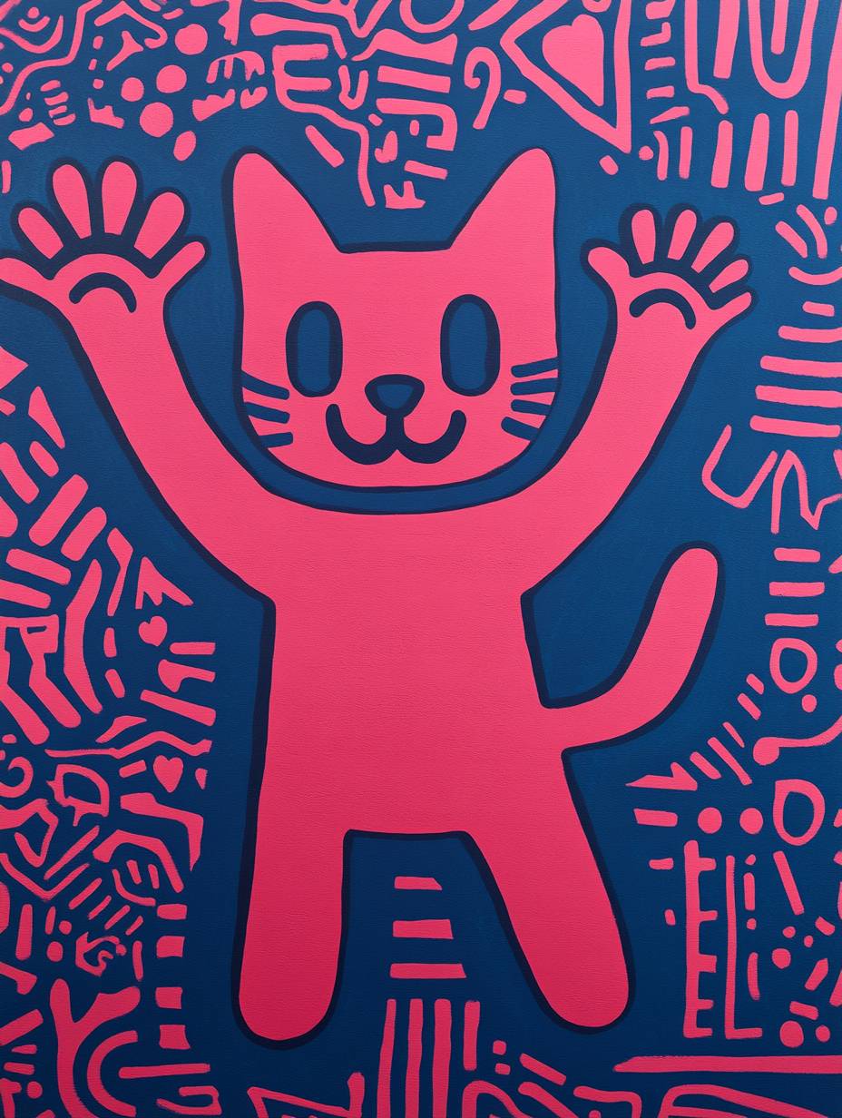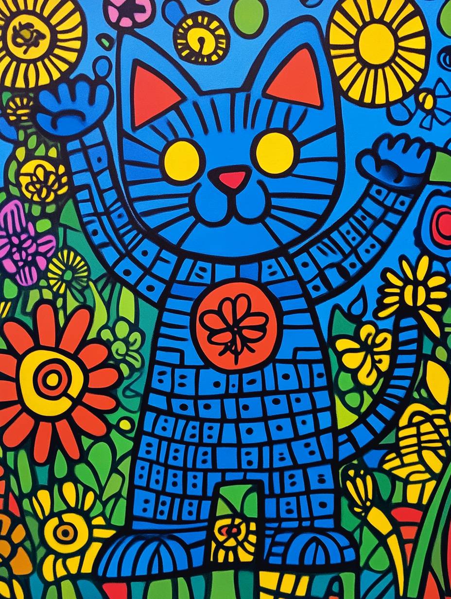 Mural by Keith Haring, a dancing cat waving its PAWS surrounded by a variety of flowers and plants, (blue tone)), geometric, linear, vivid, patterned, bold, creative, high quality, high definition,8k, --chaos 5 --ar 3:4 --v 6.1 --style raw