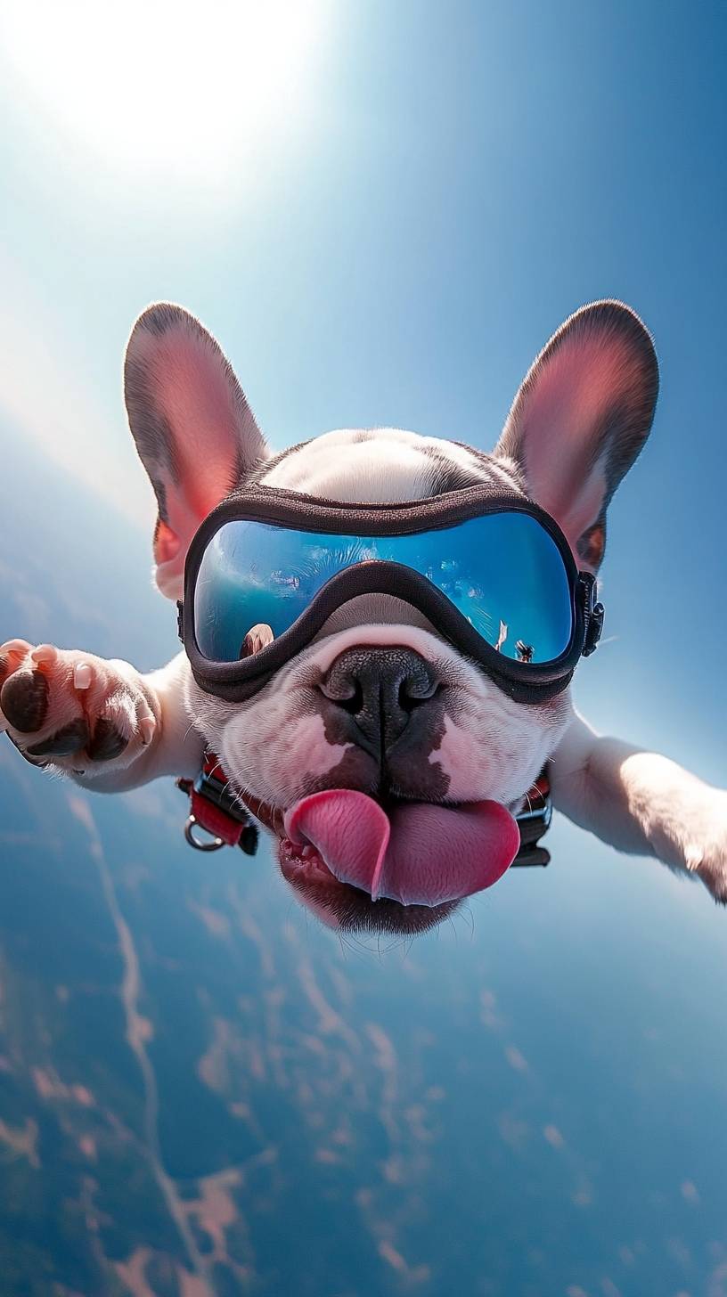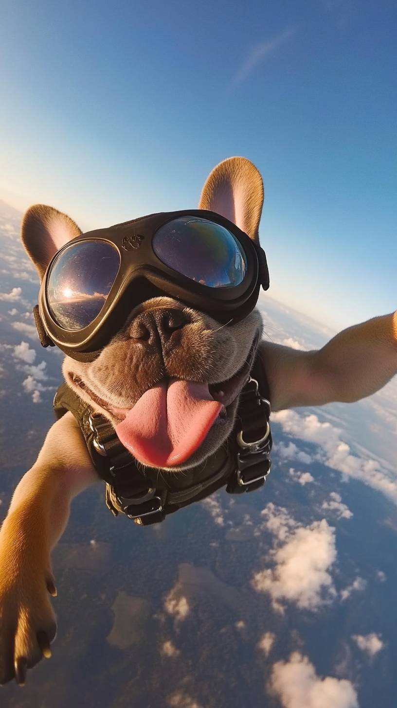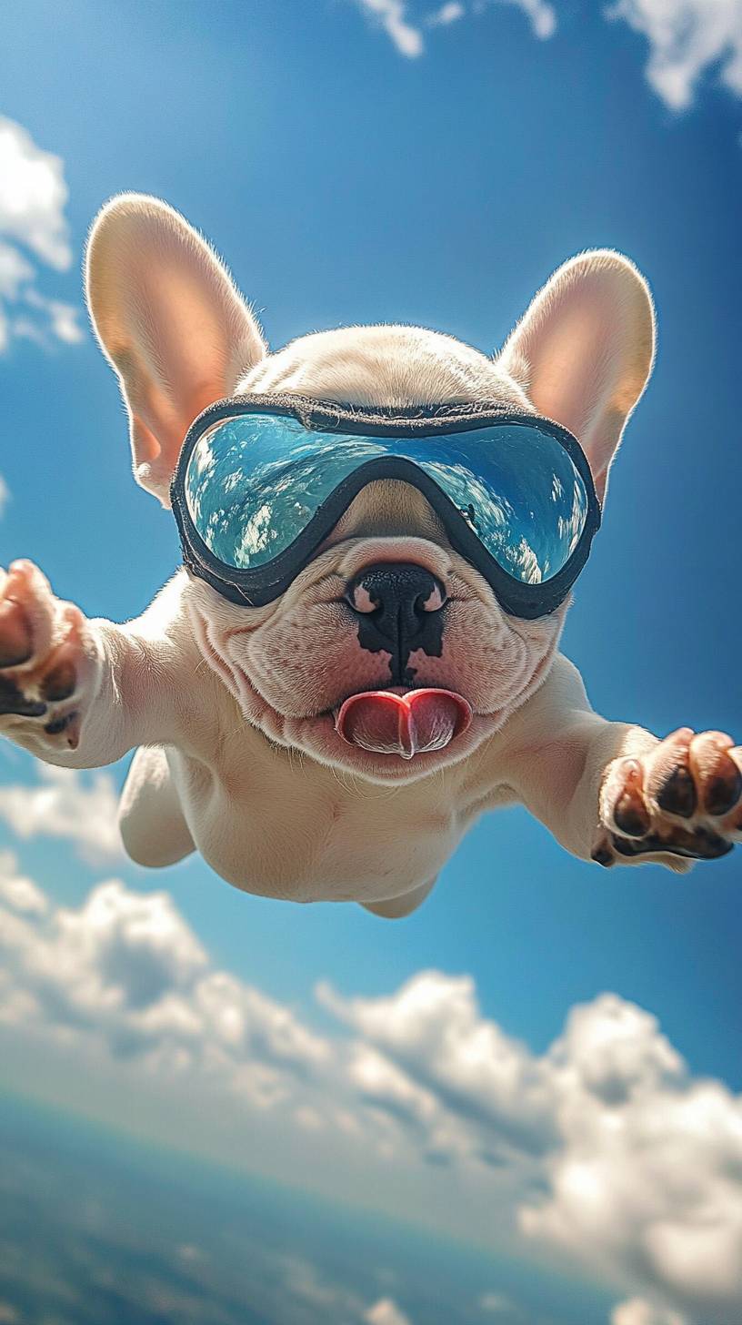 In the sky, a baby French bulldog with skydiver goggles is free falling. We see the effect of the wind on the puppy's ears and lips. He tries to stabilize himself with his paws, his tongue is out and rising upwards due to the effect of the fall. The dog bends at the waist.