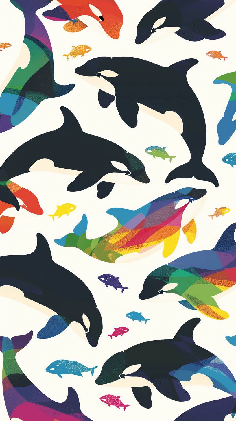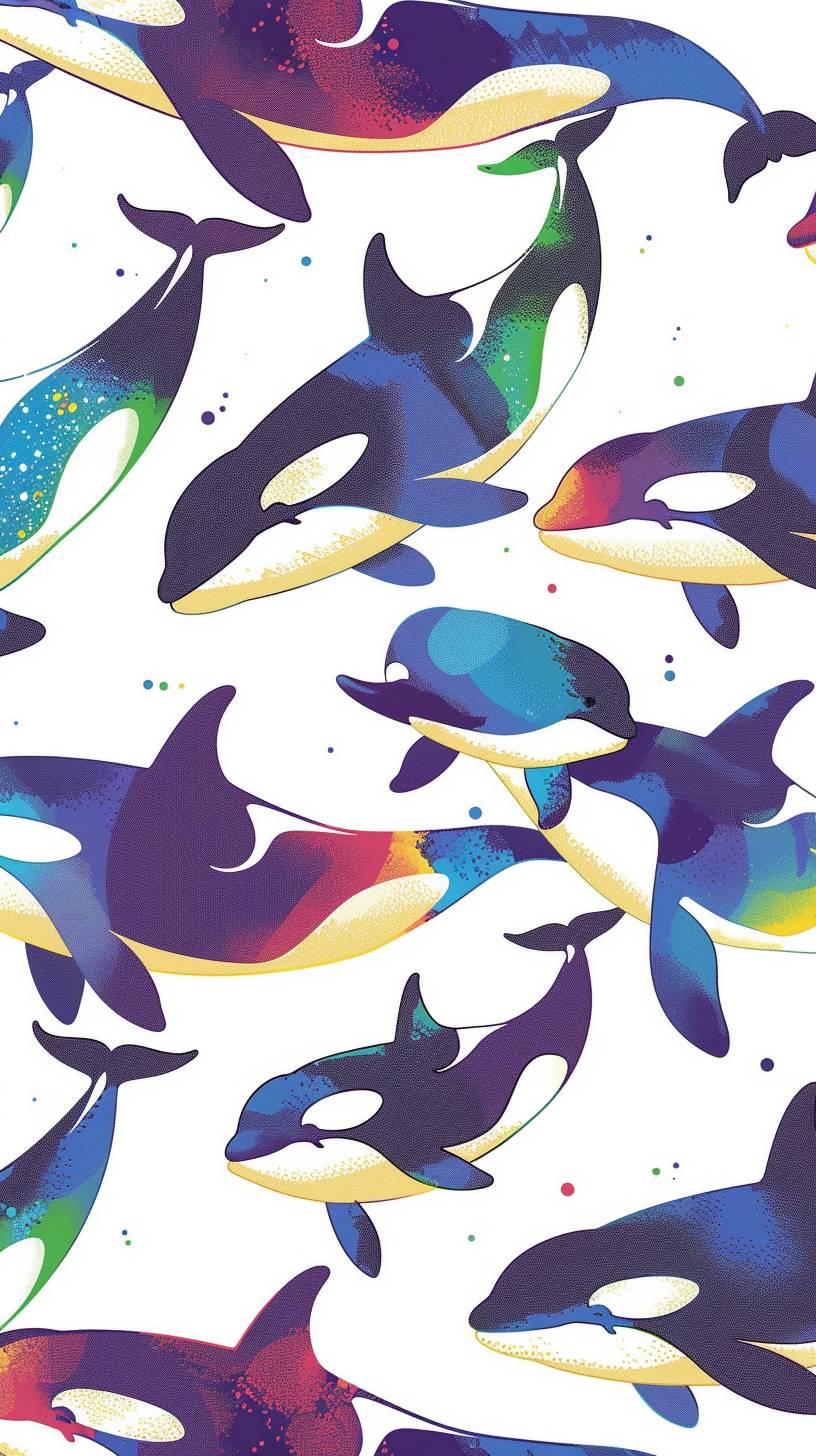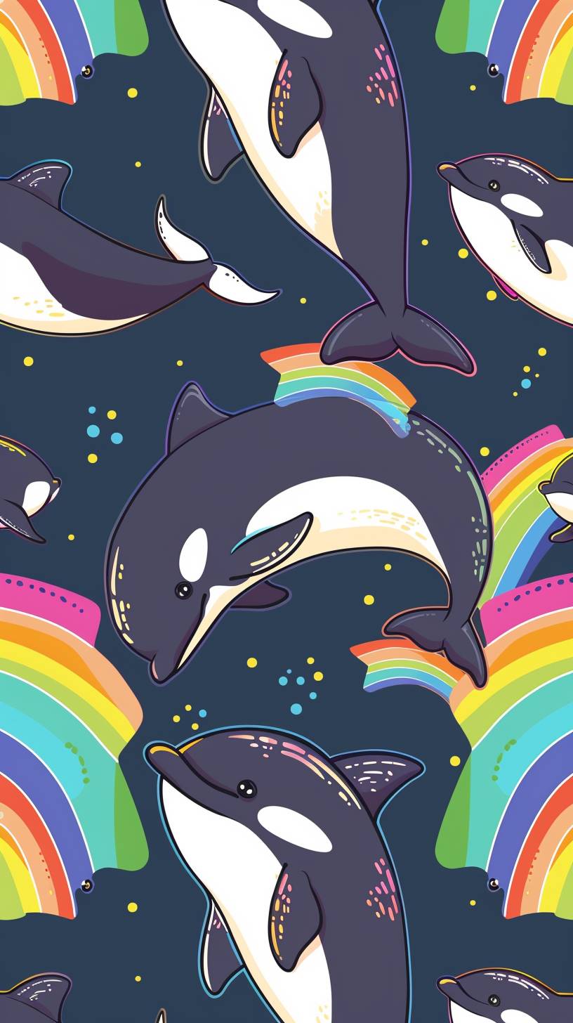 Cute cartoon with rainbow orcas jumping in a repeating pattern