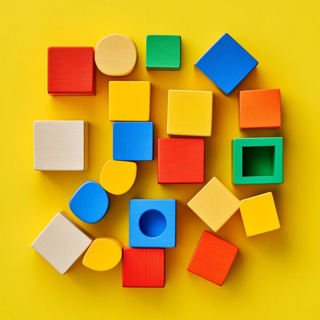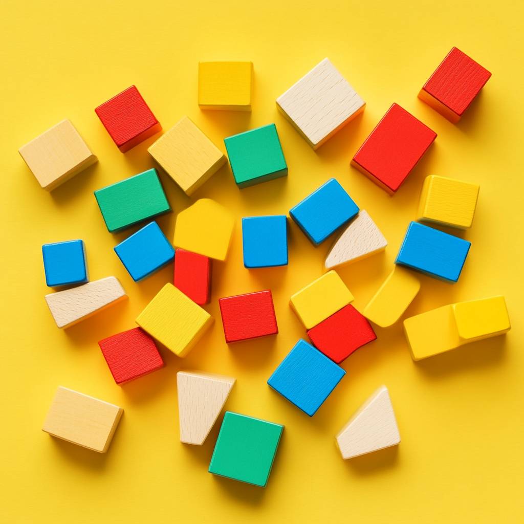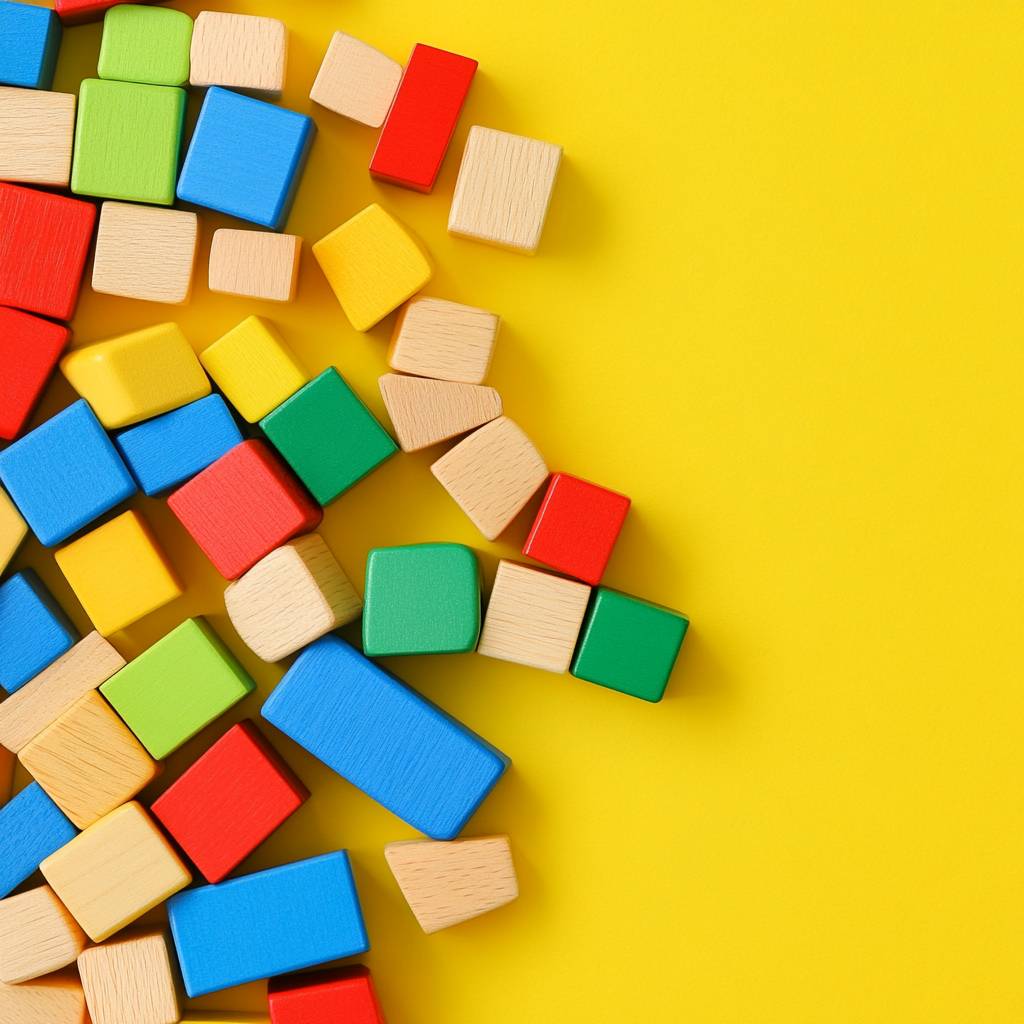 Construction game for kids. colorful Wooden building blocks, toy bricks flat lay on white background, top view, copy space border on on a yellow background, in a minimalistic style with playful and friendly typography, bright colors, flat design, no shadows or gradients, simple shapes for each letter, and a vibrant color palette. The text is arranged in an asymmetrical layout to create visual interest --v 6.1 --style raw
