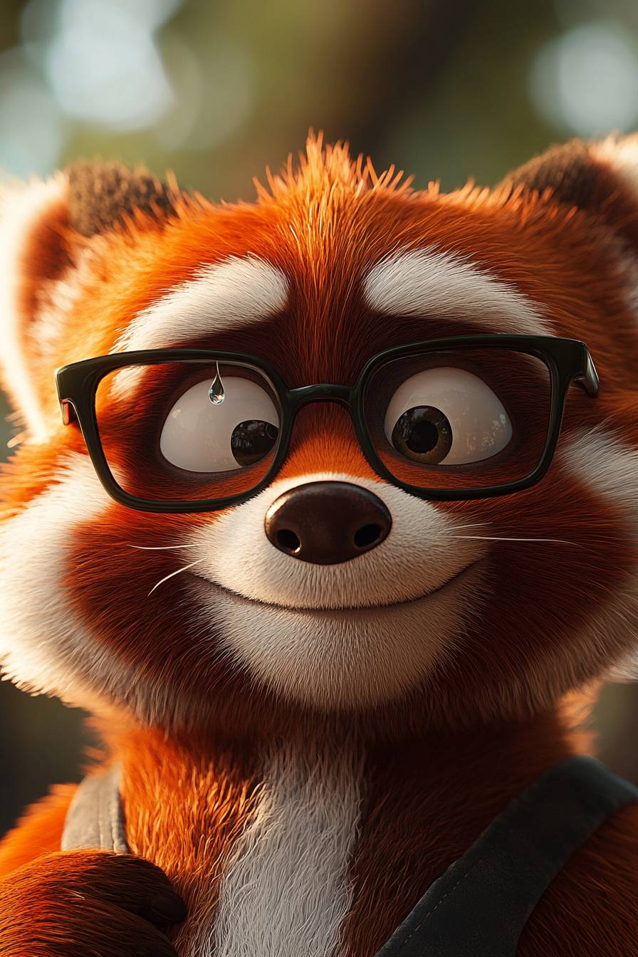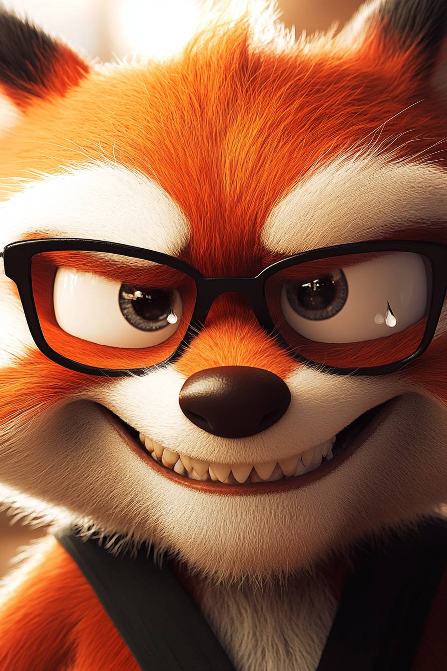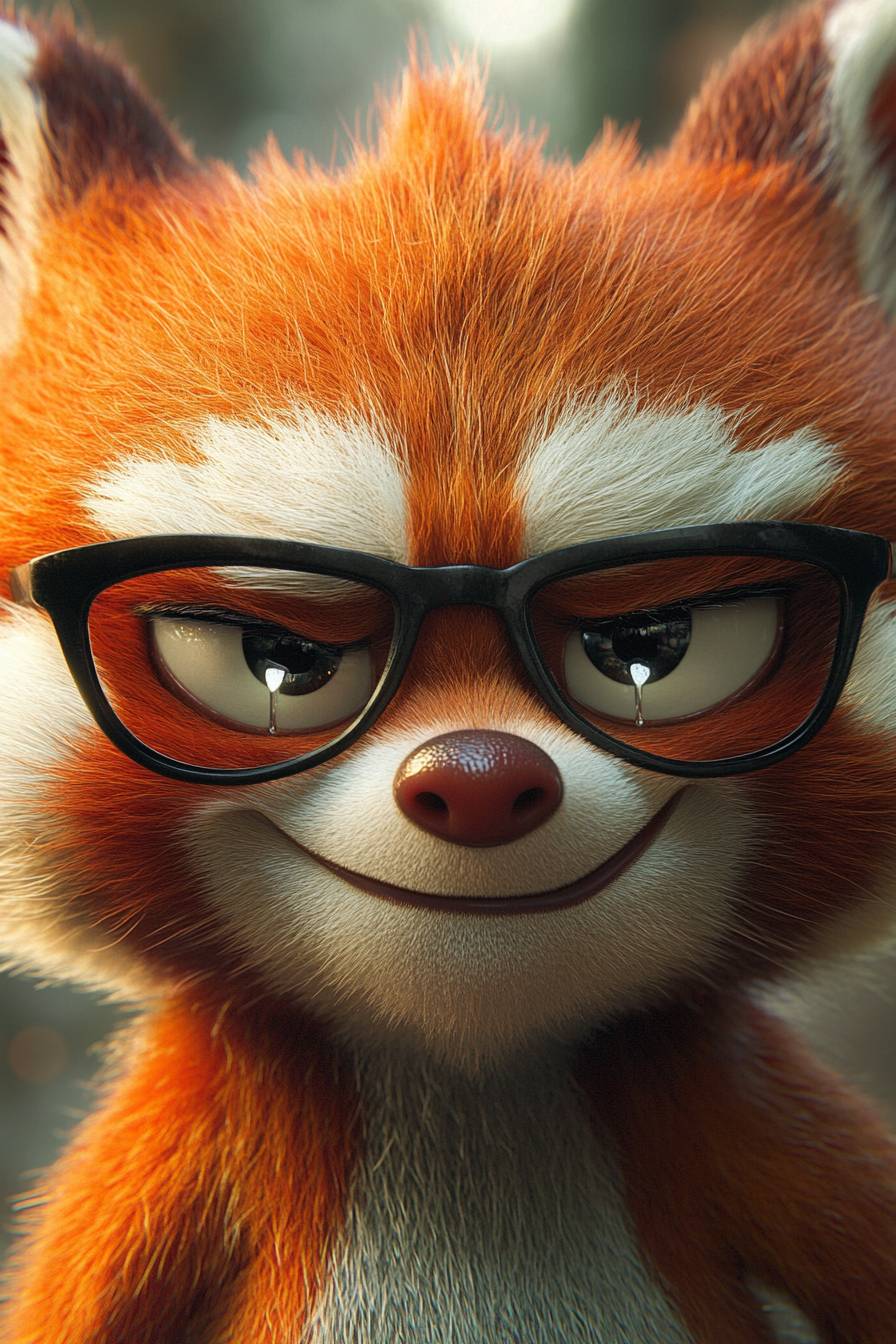 3d anime character by Disney and Pixar, close up to face, a silly dumb red panda with demonic face is showing a evilly grin, emptiness in his eyes, boring expression, the grin deformed his facial features, he's wearing old fashioned rectangle black glasses with bold border, a drop of tear in his left eye. the distorted face showing a vibe of loneliness, sadness, isolated, alienated --ar 2:3 --v 6.1 --style raw