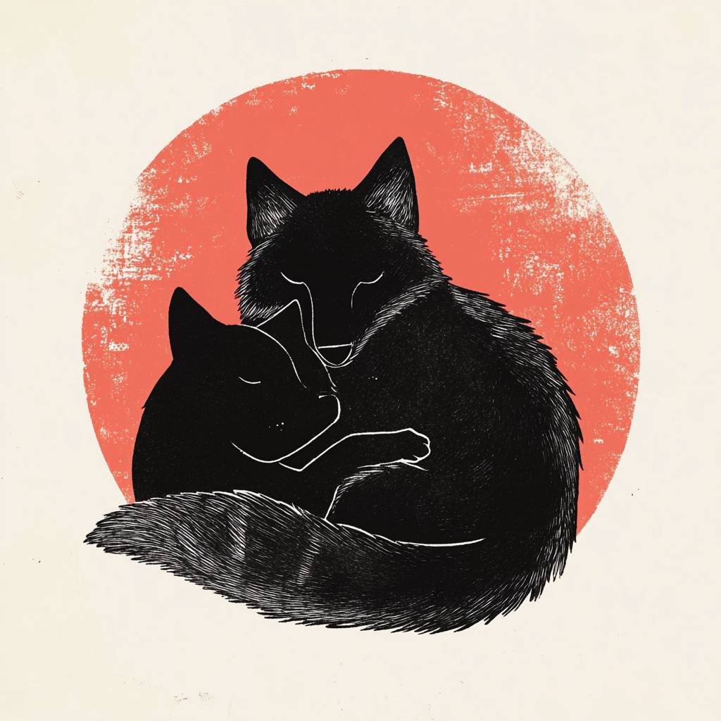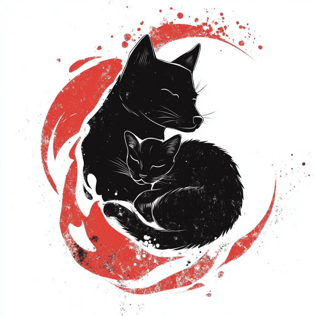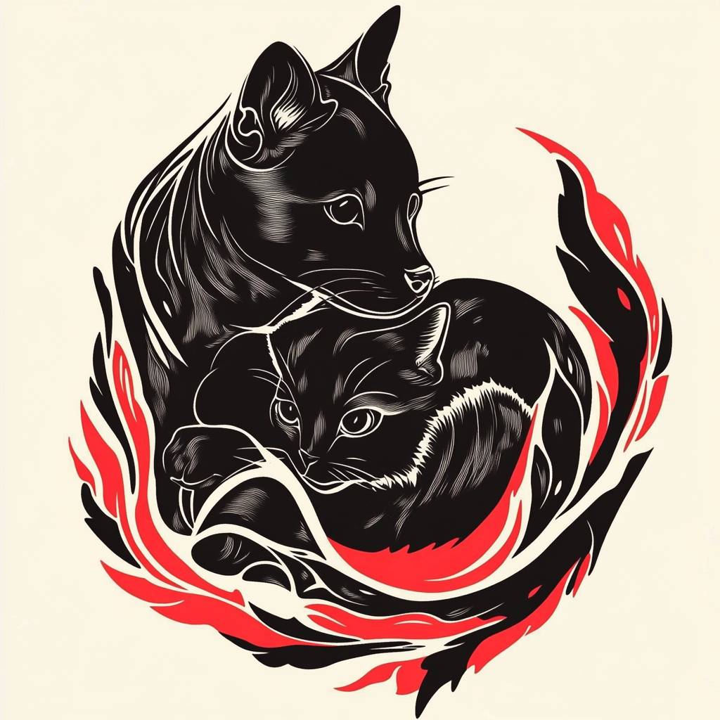 a black Mudi dog curling up with a black cat, tattoo design, modern, tattoo, black white red only, in the style of Katsushika Hokusai, abstract, minimal, stylish --ar 1:1 --v 6.1 --style raw