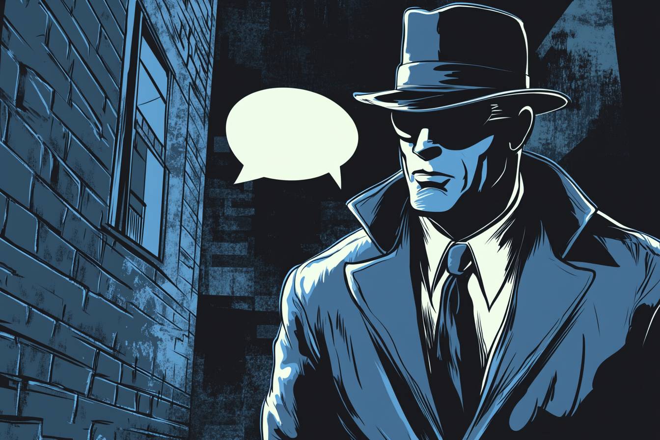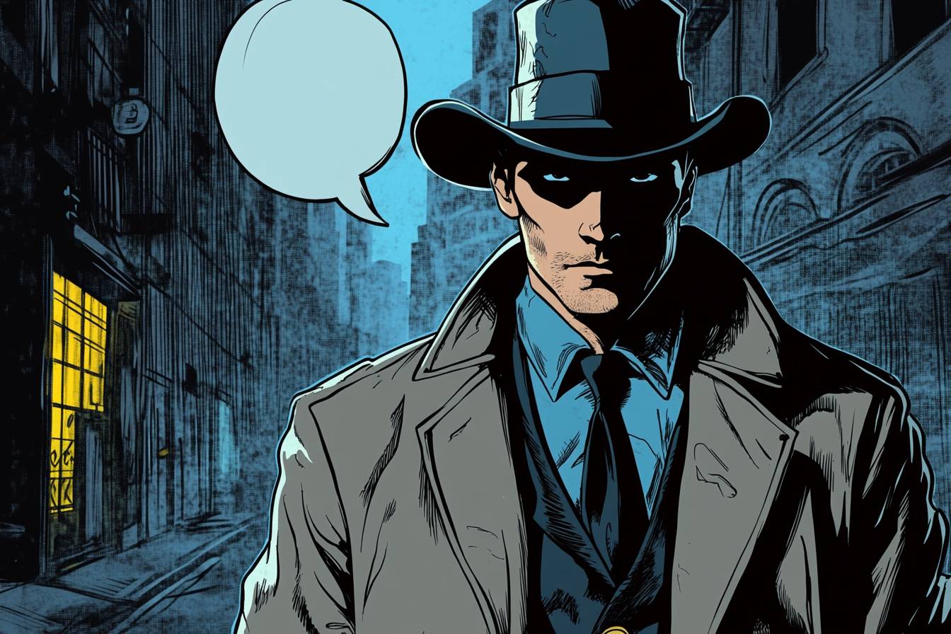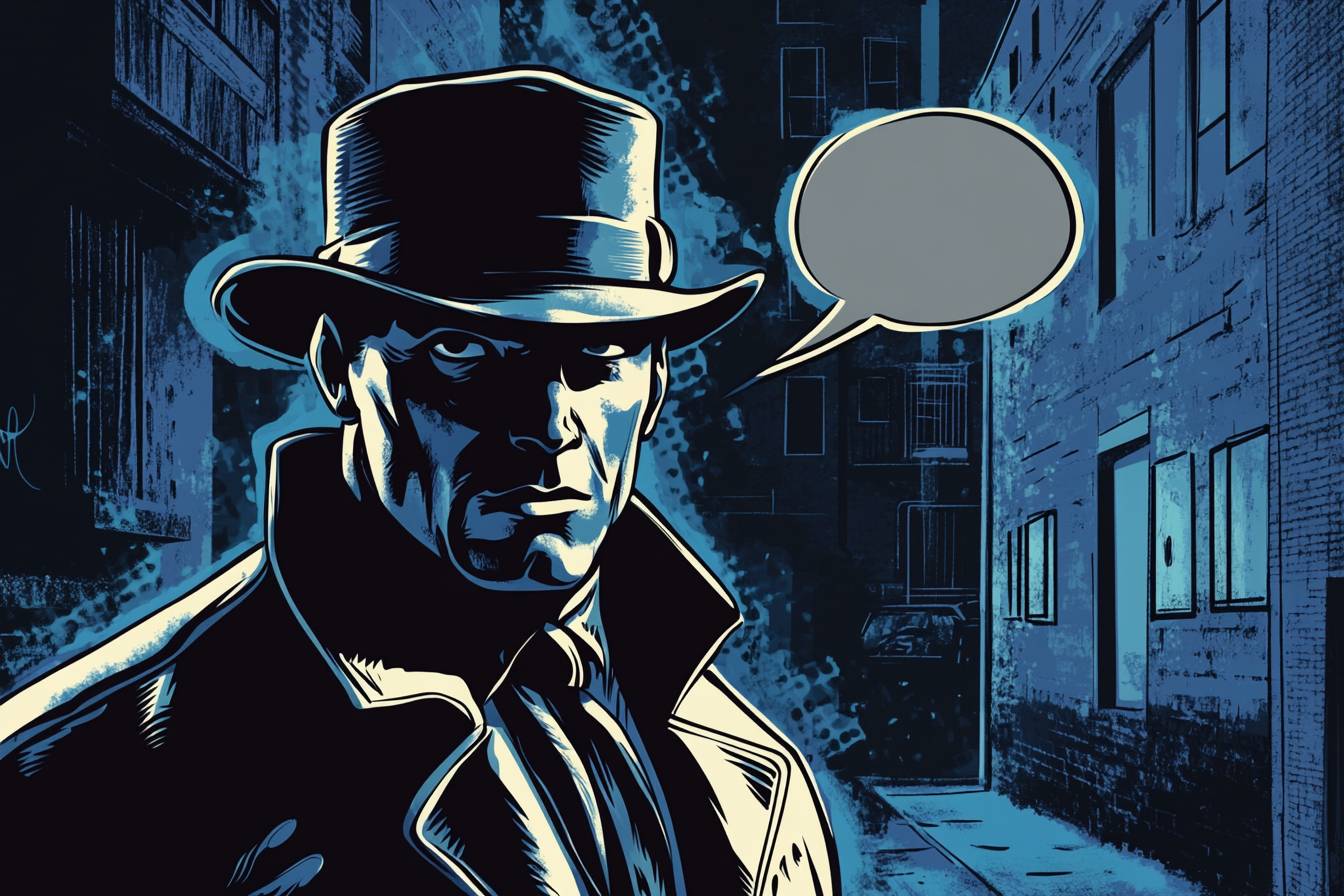 A dashing detective, in the style of vintage comic book art, bold lines and halftone dots, retro and action vibes, superhero setting, cartoon speech bubble. The background is a dark city alley at night, with a noir palette of grays and blues.