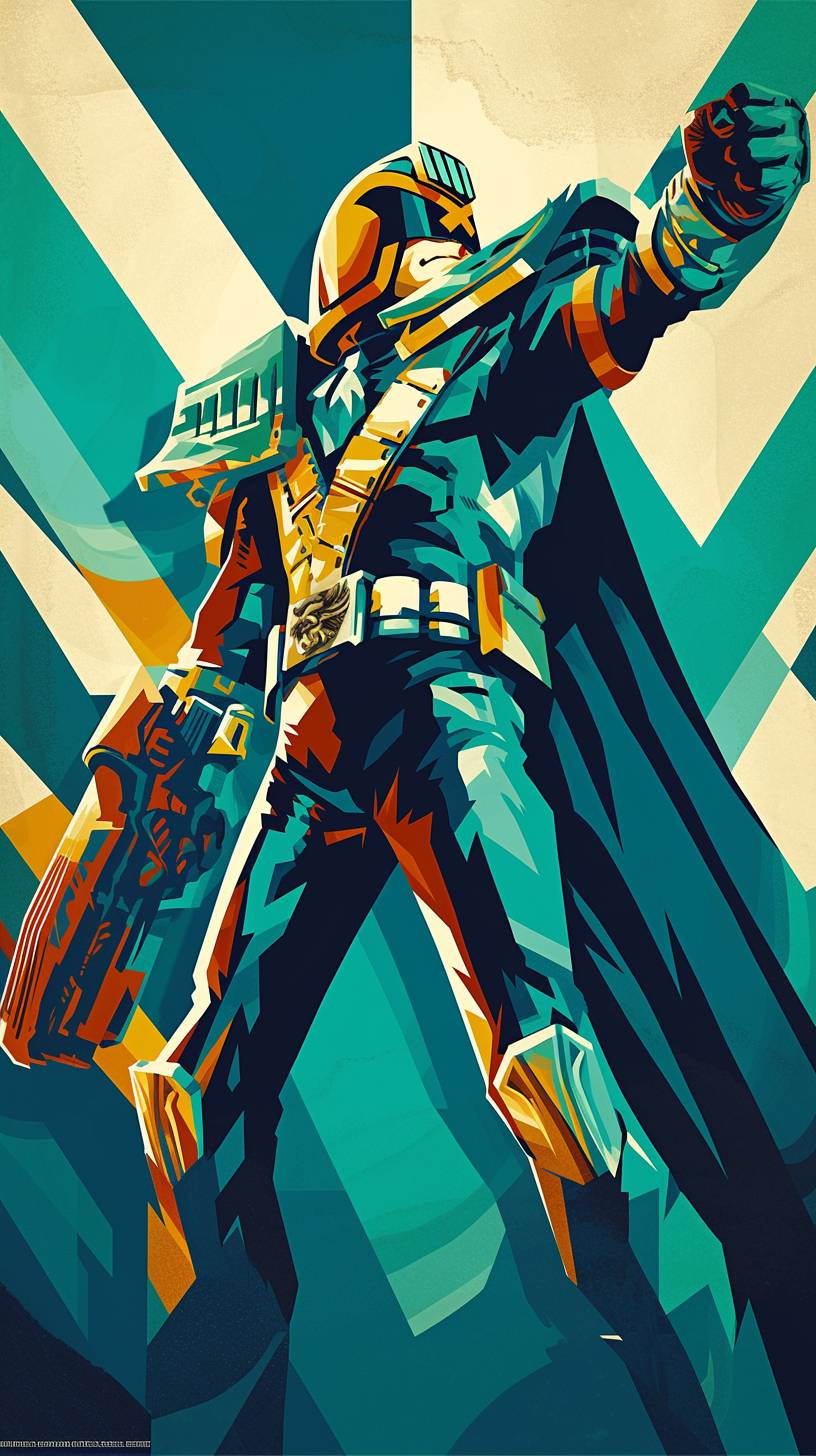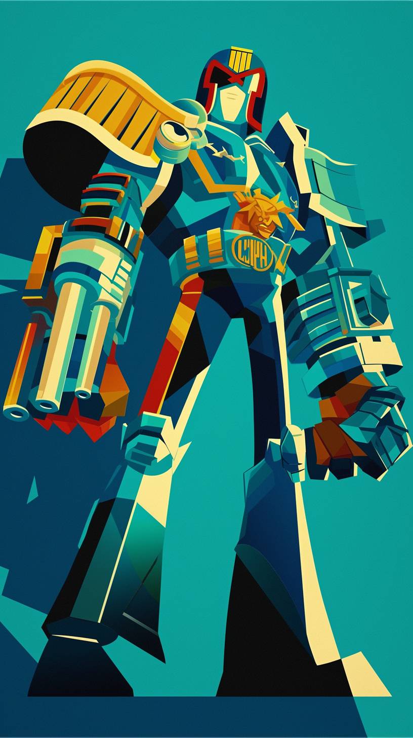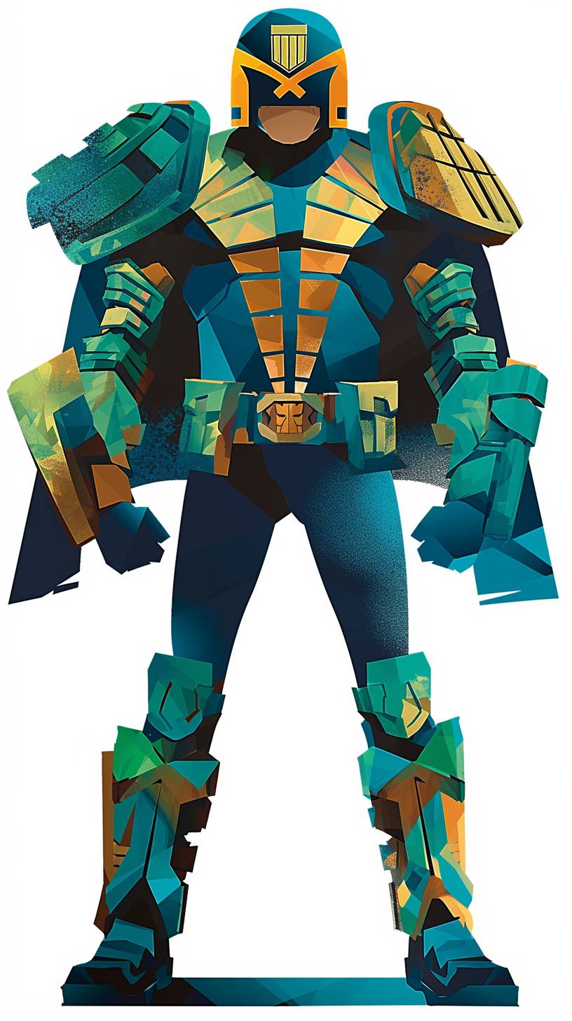 A simple drawing of Judge Dredd with simple lines, flat colors, and a stick figure in a minimalistic style and simple background.
