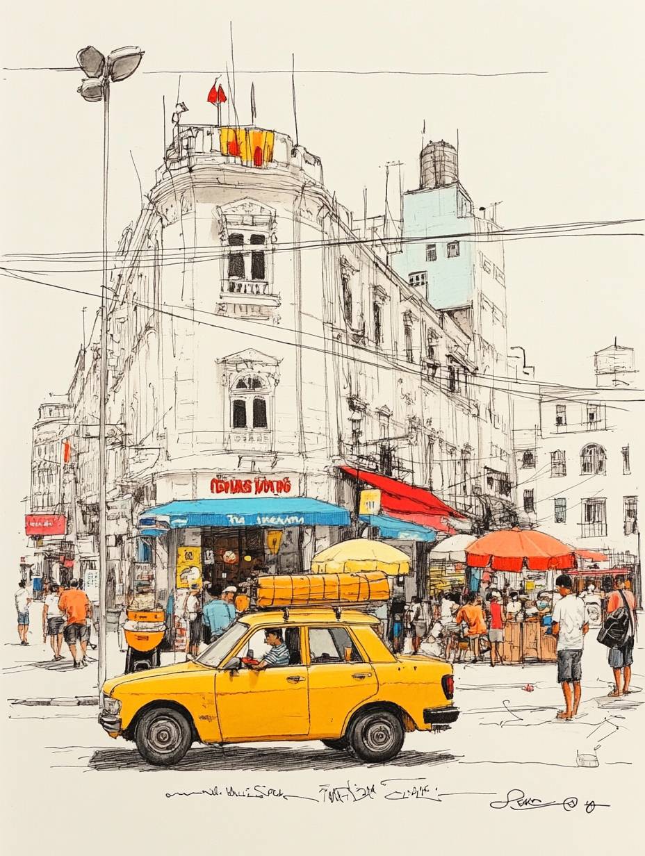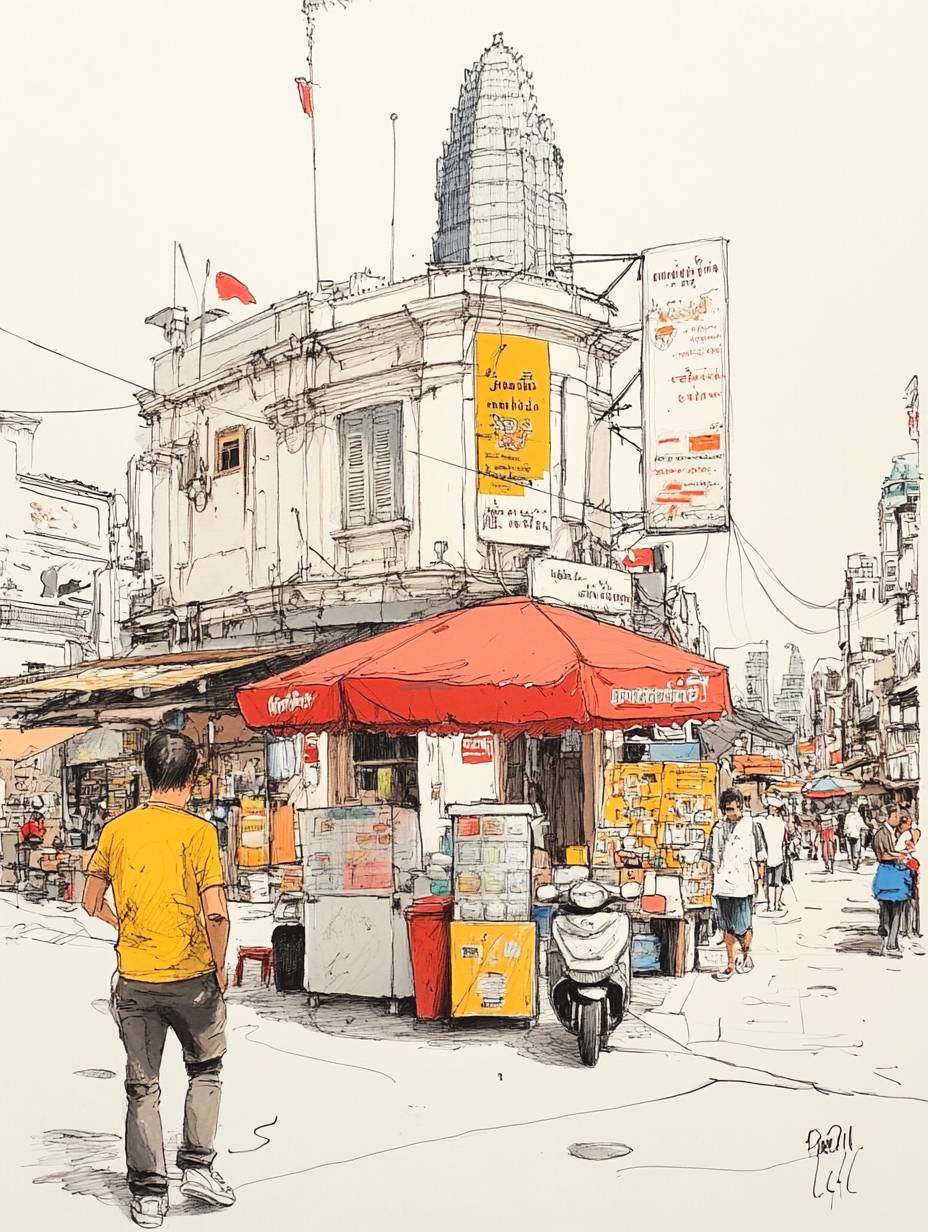 A sketch capturing the vibrant street life of a Thai city, emphasizing colorful architecture and intricate details.